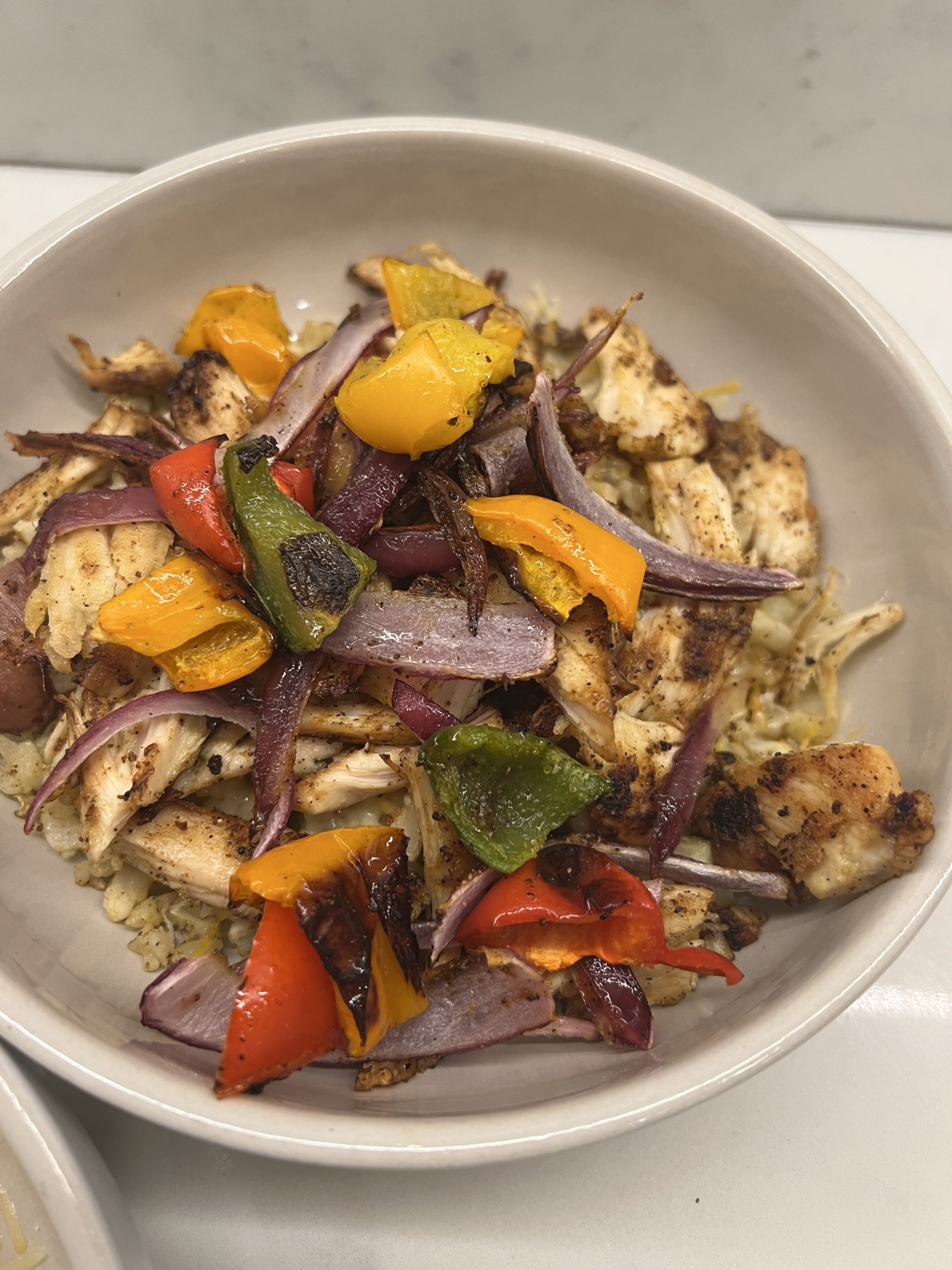 Meanwhile, make the cauliflower rice. Sauté for 5-7 min with a little olive oil and fajita seasoning.