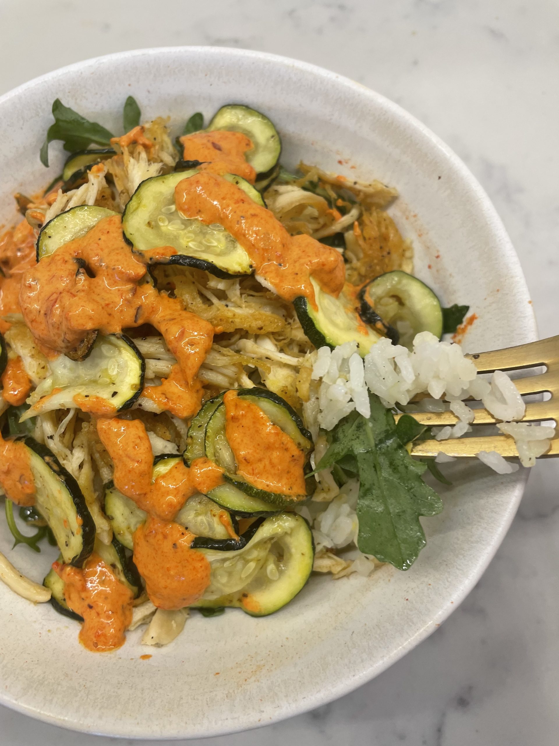 Here’s what you need (makes 2 bowls): 2 cups arugula 1 cup cooked white rice 1 zucchini, sliced 1.5 cups of cooked