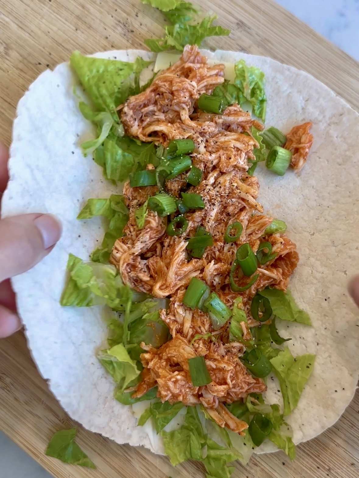 Layer your romaine and buffalo chicken on top then sprinkle with your green onions, salt, and pepper.