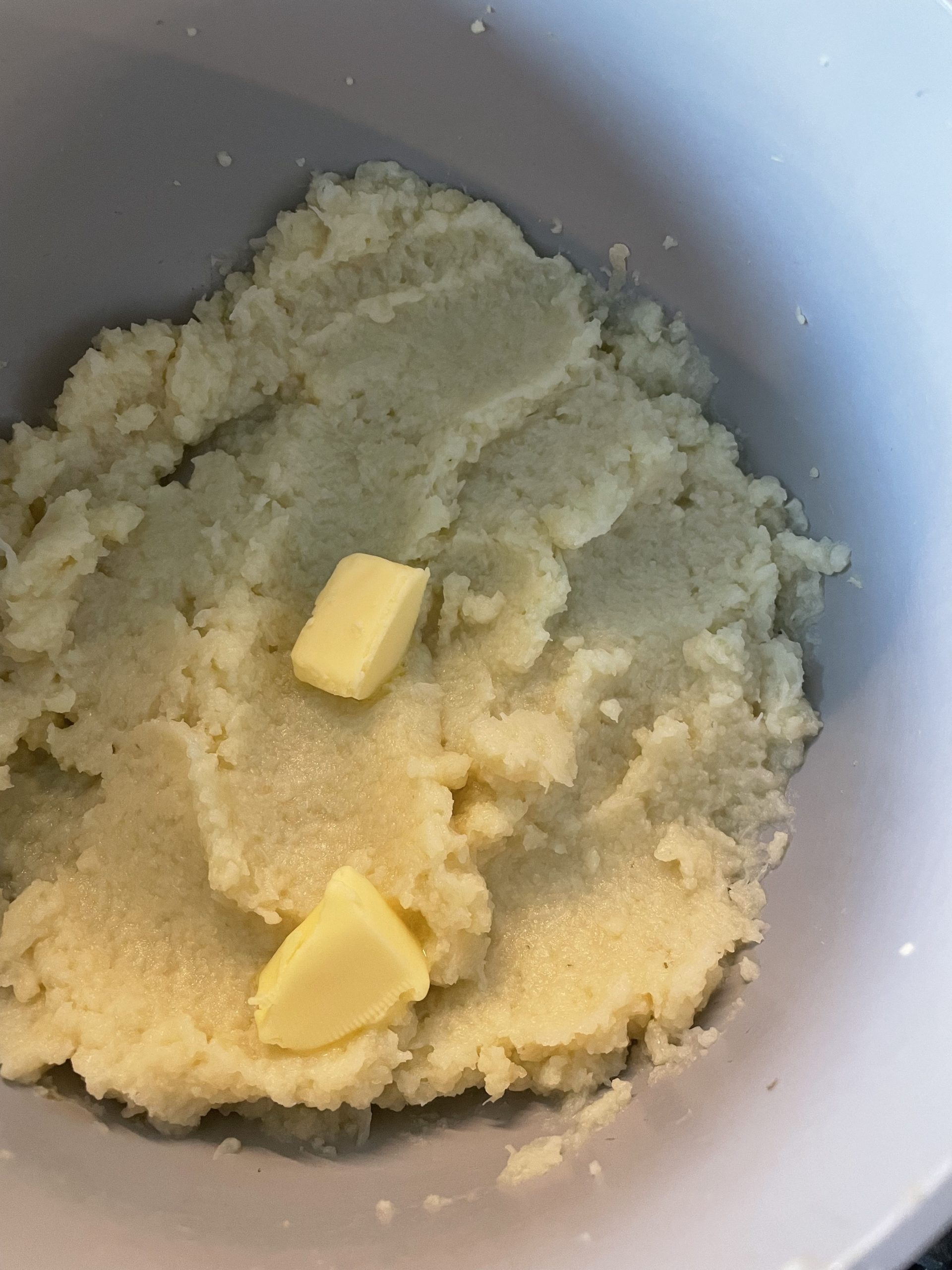 For the cauliflower mash, add cut up cauliflower to a pot filled with water and bring to a boil. Cook for about 15 minutes or until it’s fork tender.  Then add garlic and pepper and salt and mix together with an immersion blender until  it’s nice and creamy!