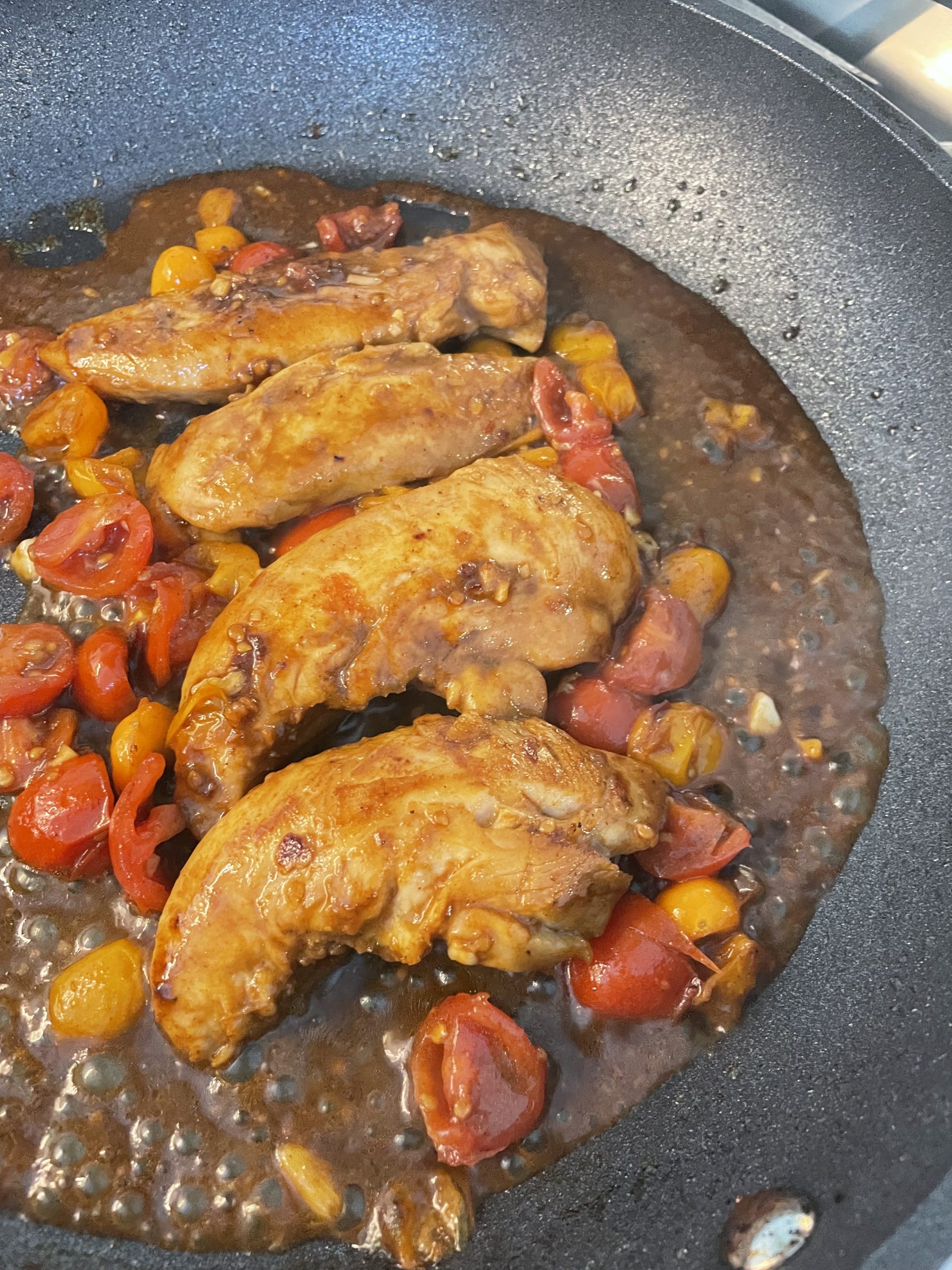 Marinate chicken in balsamic with tomatoes and garlic overnight if you can but an hour would work if you don’t have time! Then cook the chicken on the stovetop in a little bit of olive oil, with the tomatoes, for about 5-6 minutes on each side or until the chicken is fully cooked. The tomatoes will start to crack open once they are cooked through! This will give the chicken such a nice flavor!