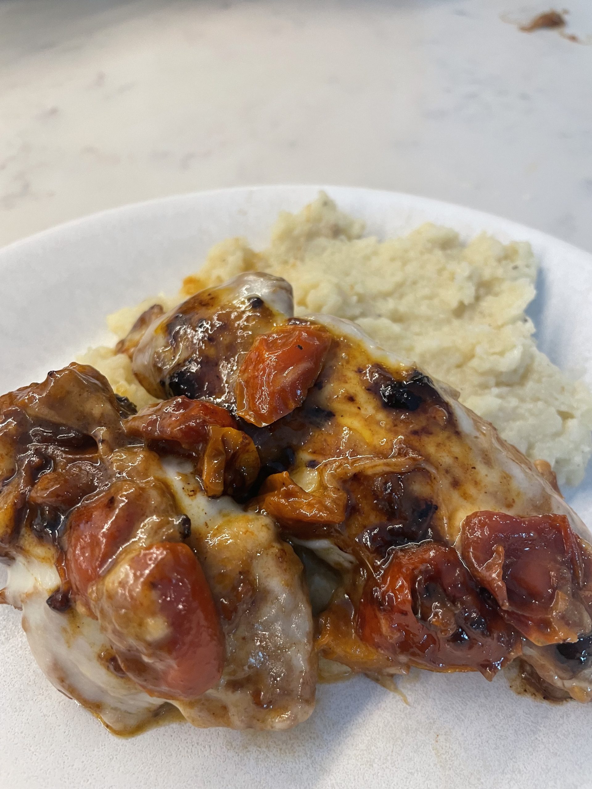 This meal is INSANE you guys: Balsamic chicken with tomatoes, pesto, mozzarella, mashed cauliflower, and roasted asparagus!
