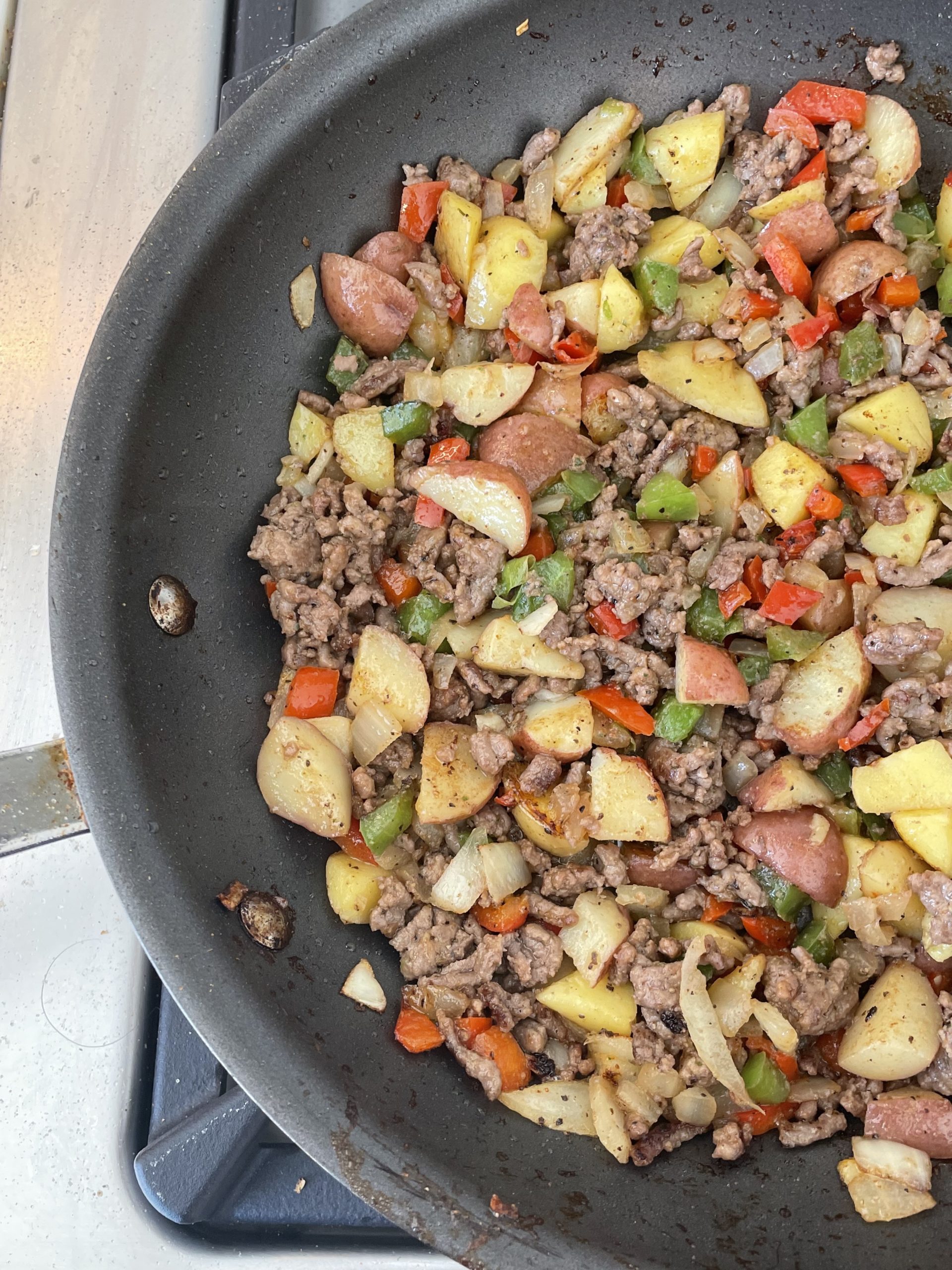 Cook for about 10 minutes or until your beef is fully cooked and the potatoes are getting nice and crispy.