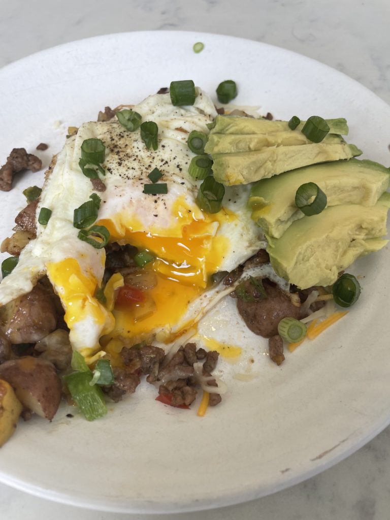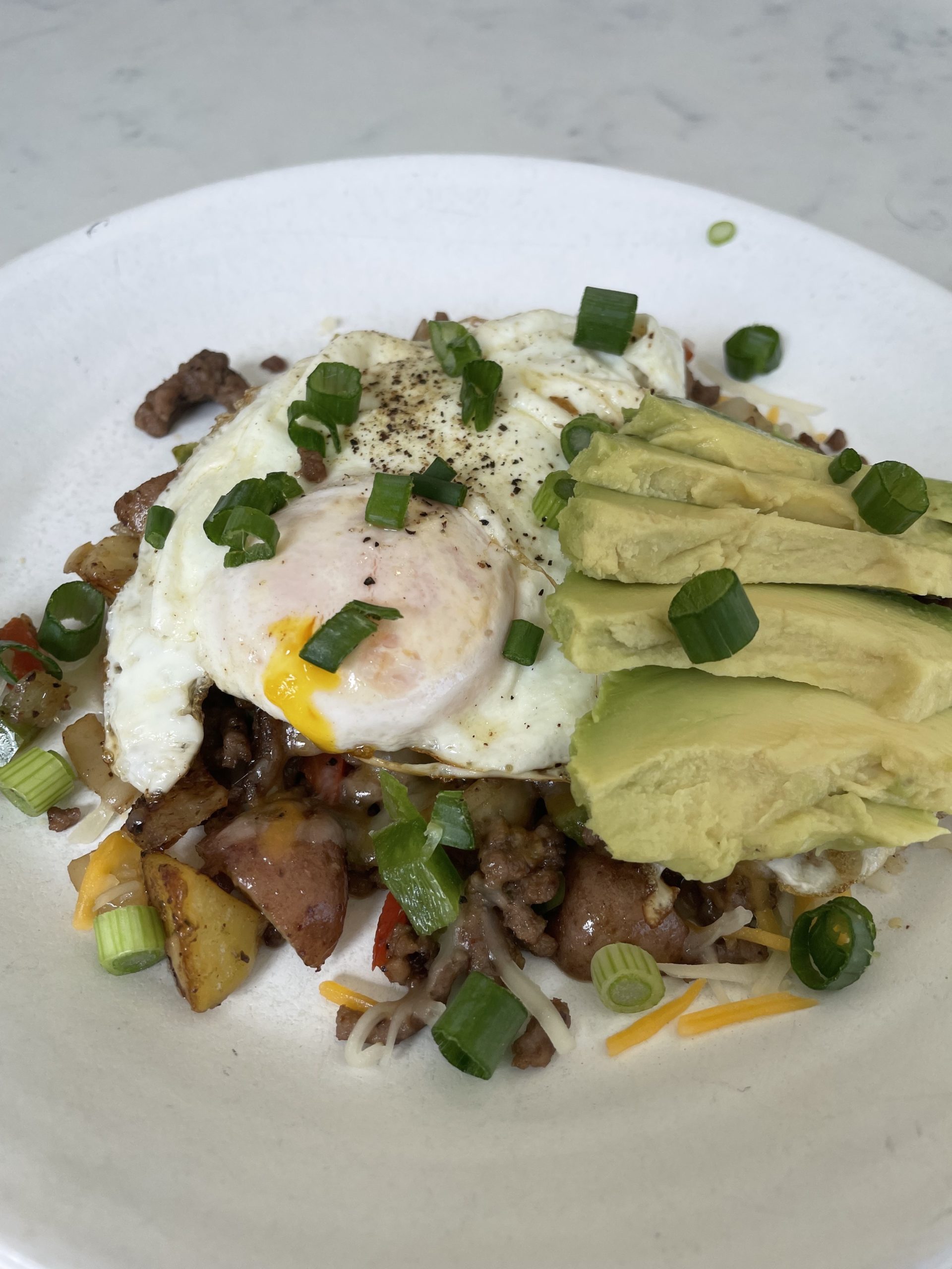 Then put a serving of the beef hash on a plate and top with shredded cheese, egg cooked to your liking, avocado and green onion! Feel free to add hot sauce too!