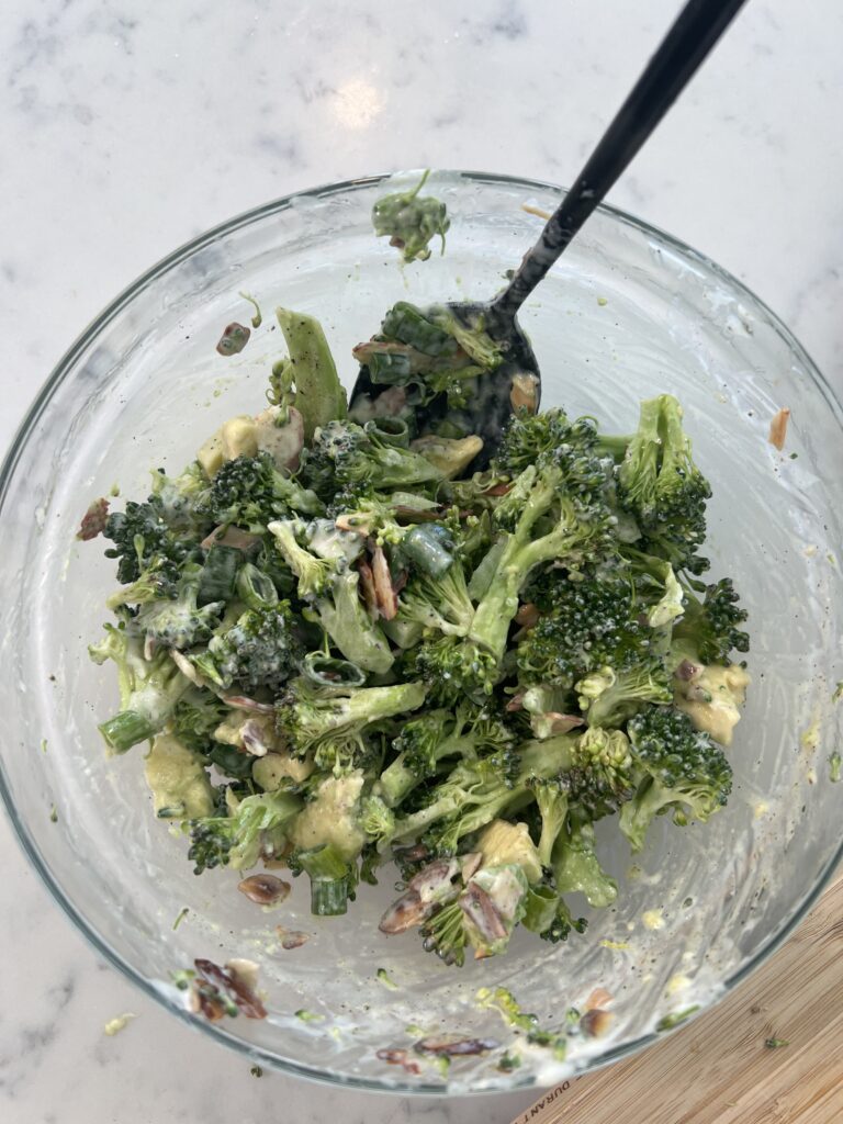 Add your diced broccoli, toasted almonds, olive oil, Caesar dressing, avocado, green onions, squeeze of lemon, and seasonings to a bowl and mix. It’s that simple!