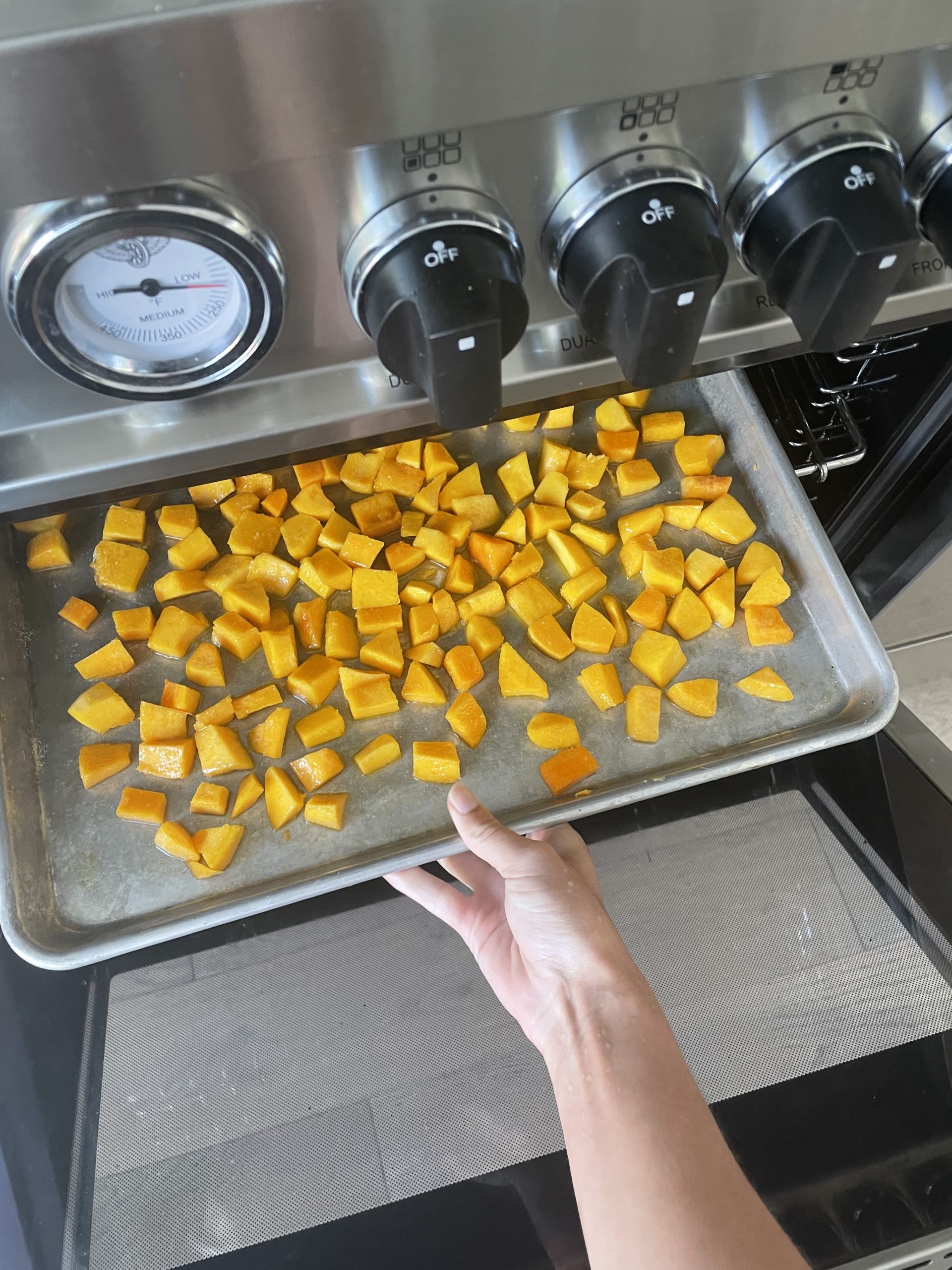First, we are going to roast up some butternut squash. Cut the butternut squash into small cubes and drizzle with olive oil, onion powder, garlic powder and sea salt. Bake at 420 for about 35 minutes.