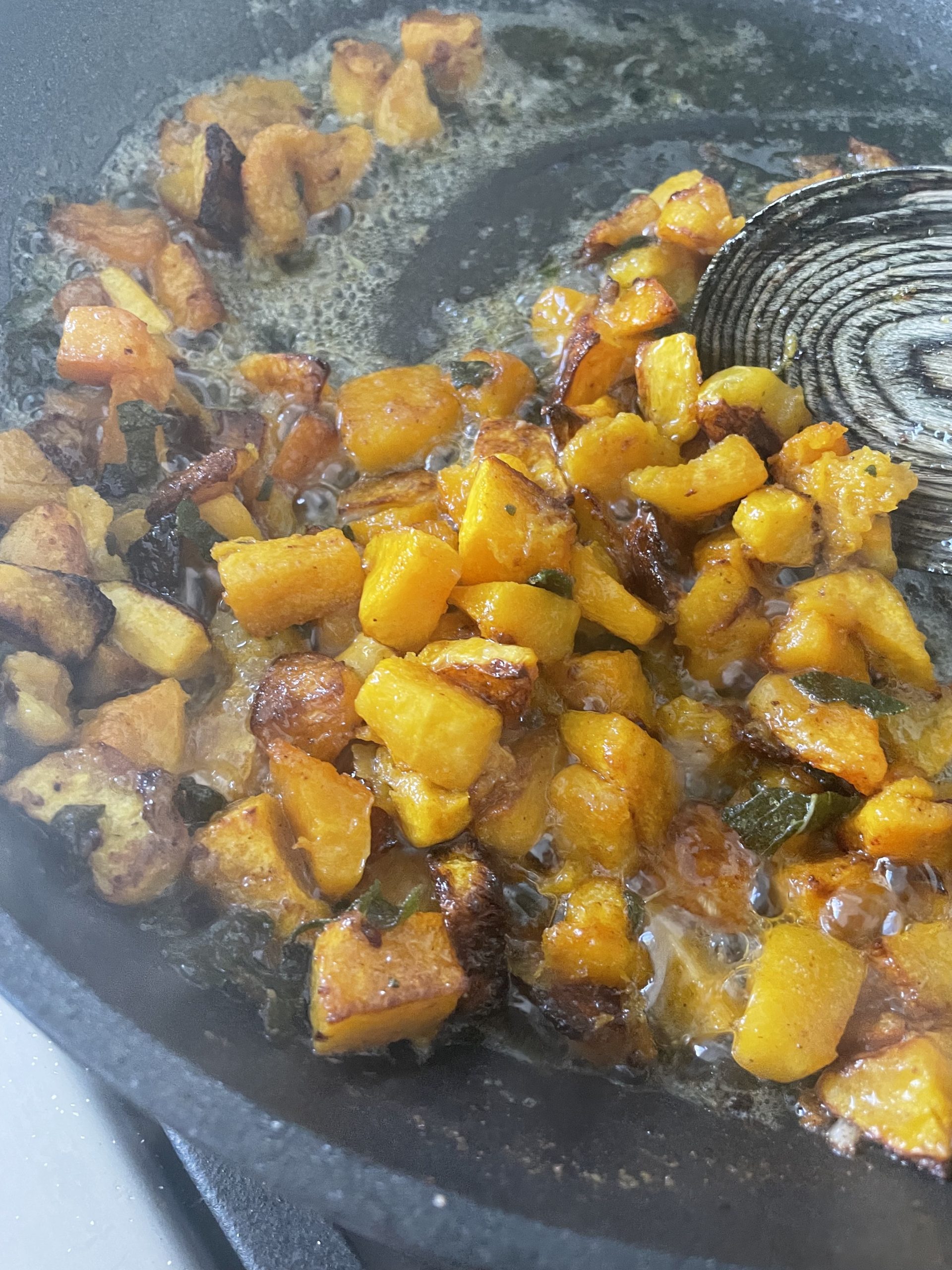 Take your roasted butternut squash and add it to the brown butter sage sauce and mix until all of the squash is evenly coated.