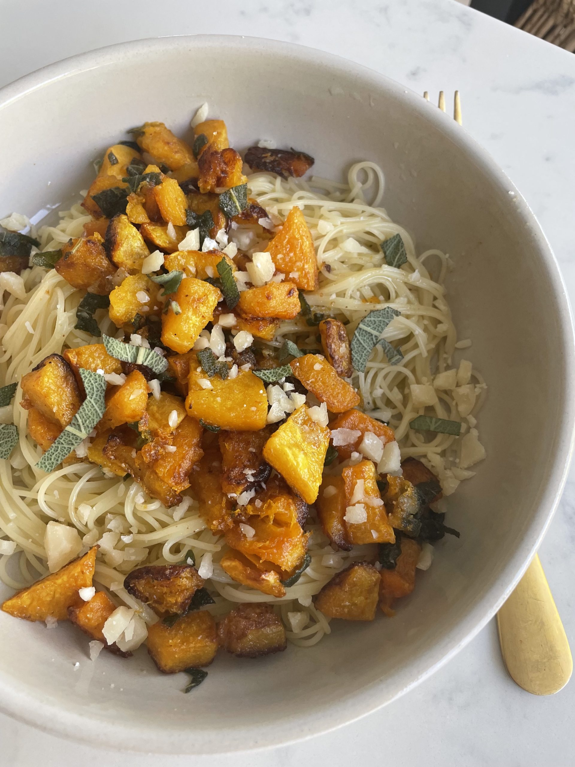 Equally separate the angel hair pasta into 2 bowls and then split the butternut squash brown butter sage sauce on top. Lastly, top with 1/3 parmesan cheese, divided evenly on top of the two bowls of pasta!