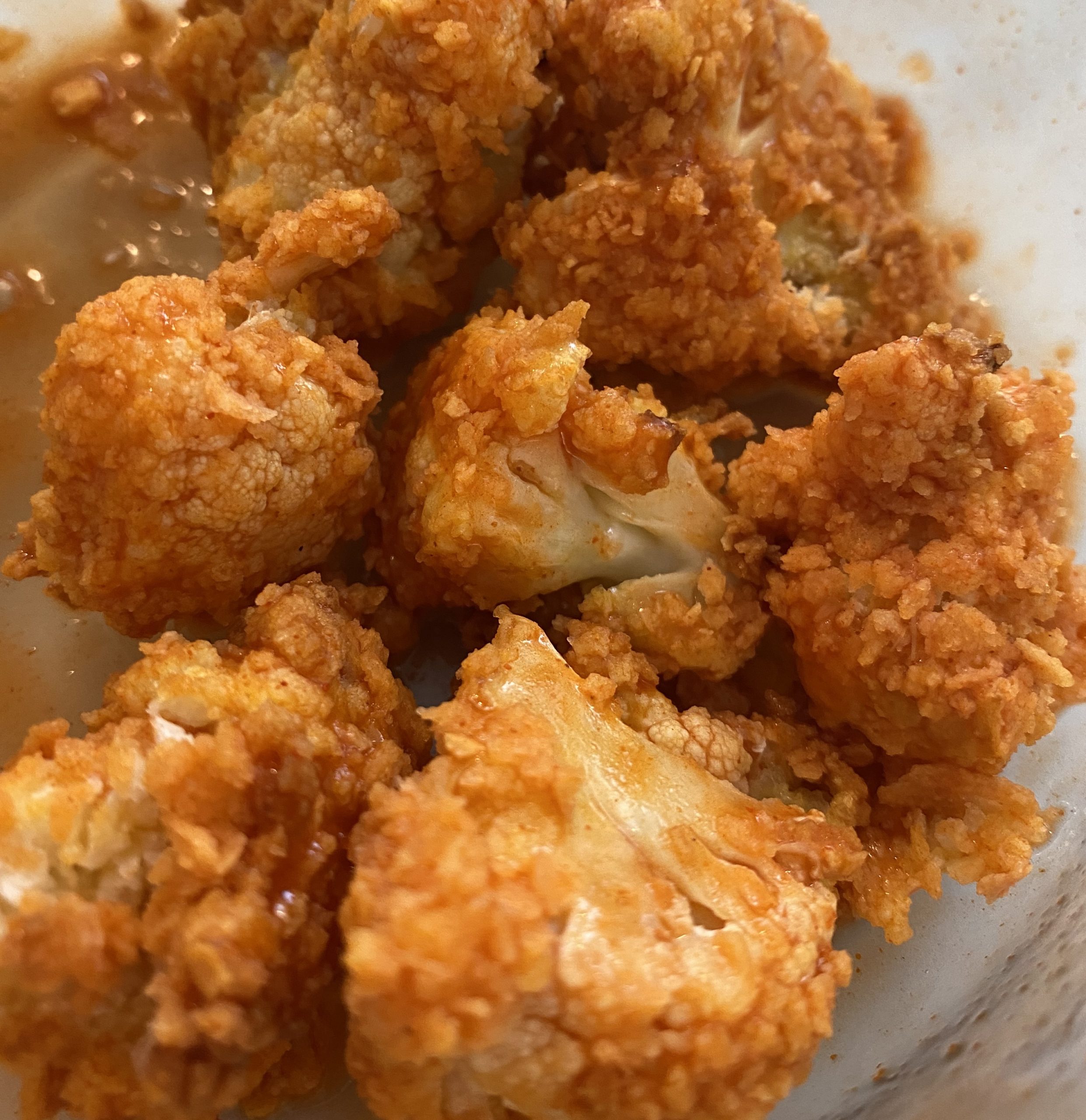 Then dip in the egg wash and then roll in the panko breadcrumbs (make sure the entire piece of cauliflower is covered)