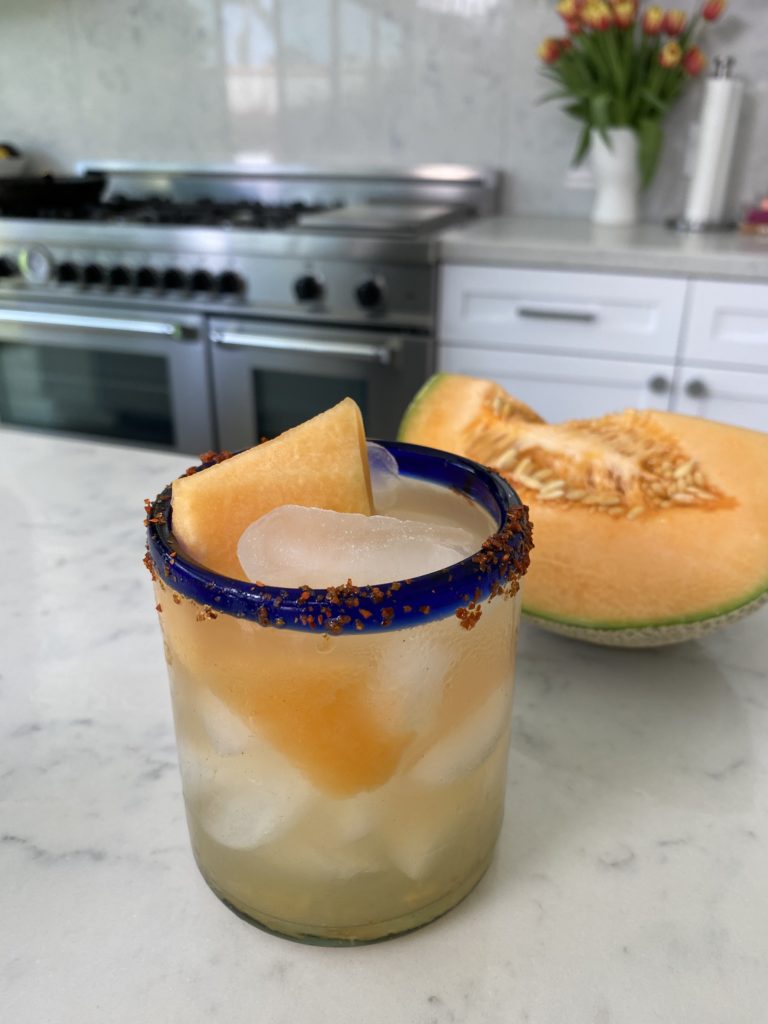 Take your cup and press a lime around the rim and dip in tajin! This spicy tajin rim just gives your drink a nice little kick and balances out the sweetness of the cantaloupe.