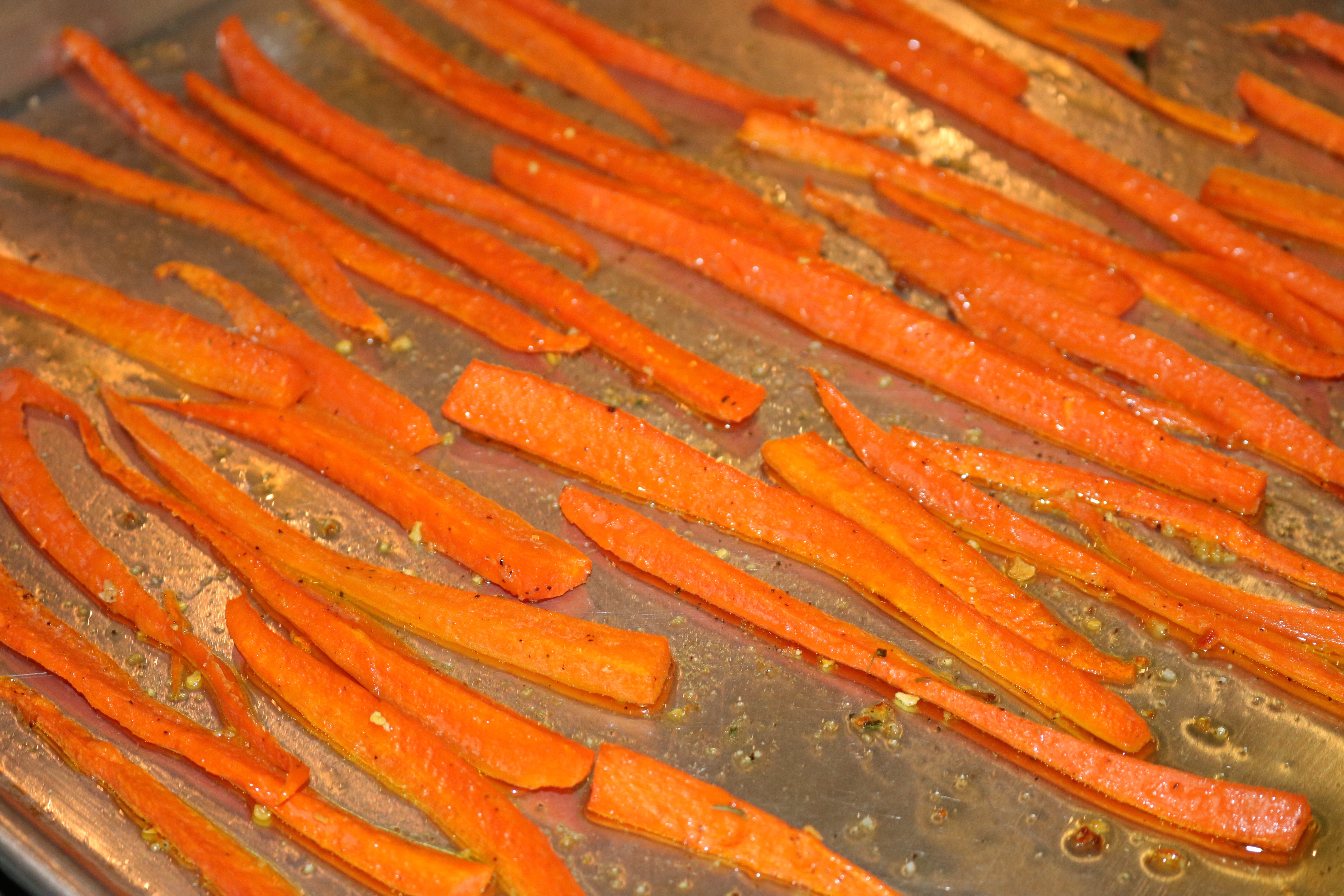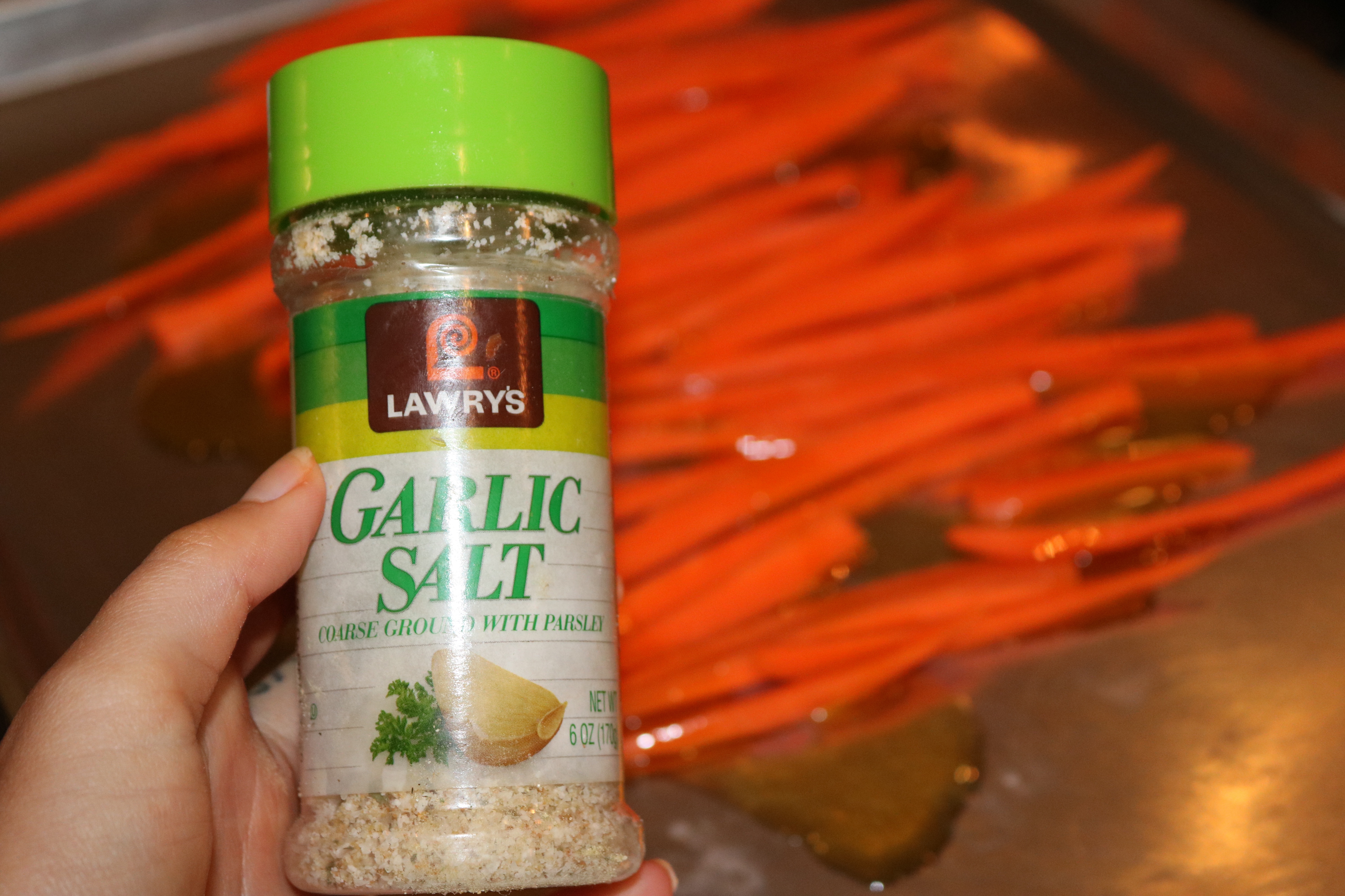 Pour on olive oil. Sprinkle on pepper and garlic salt. Massage around until the oil and spices are evenly mixed throughout the carrots.Â