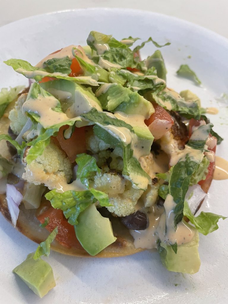 Then top with baked cauliflower, red onion, diced tomato and avocado. Add lettuce and vegan chipotle aioli (I used veganaise with a touch of water).