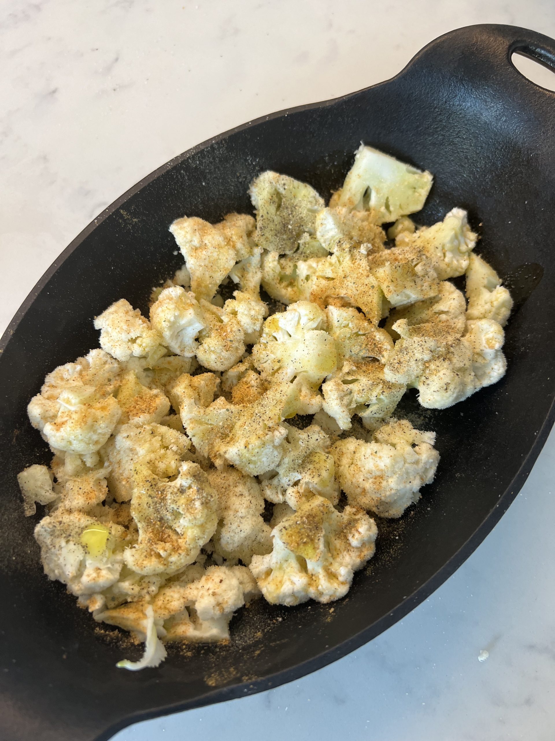 Add your prepped cauliflower to a skillet or baking dish of choice and season with Lawrys, olive oil, garlic powder, and pepper.