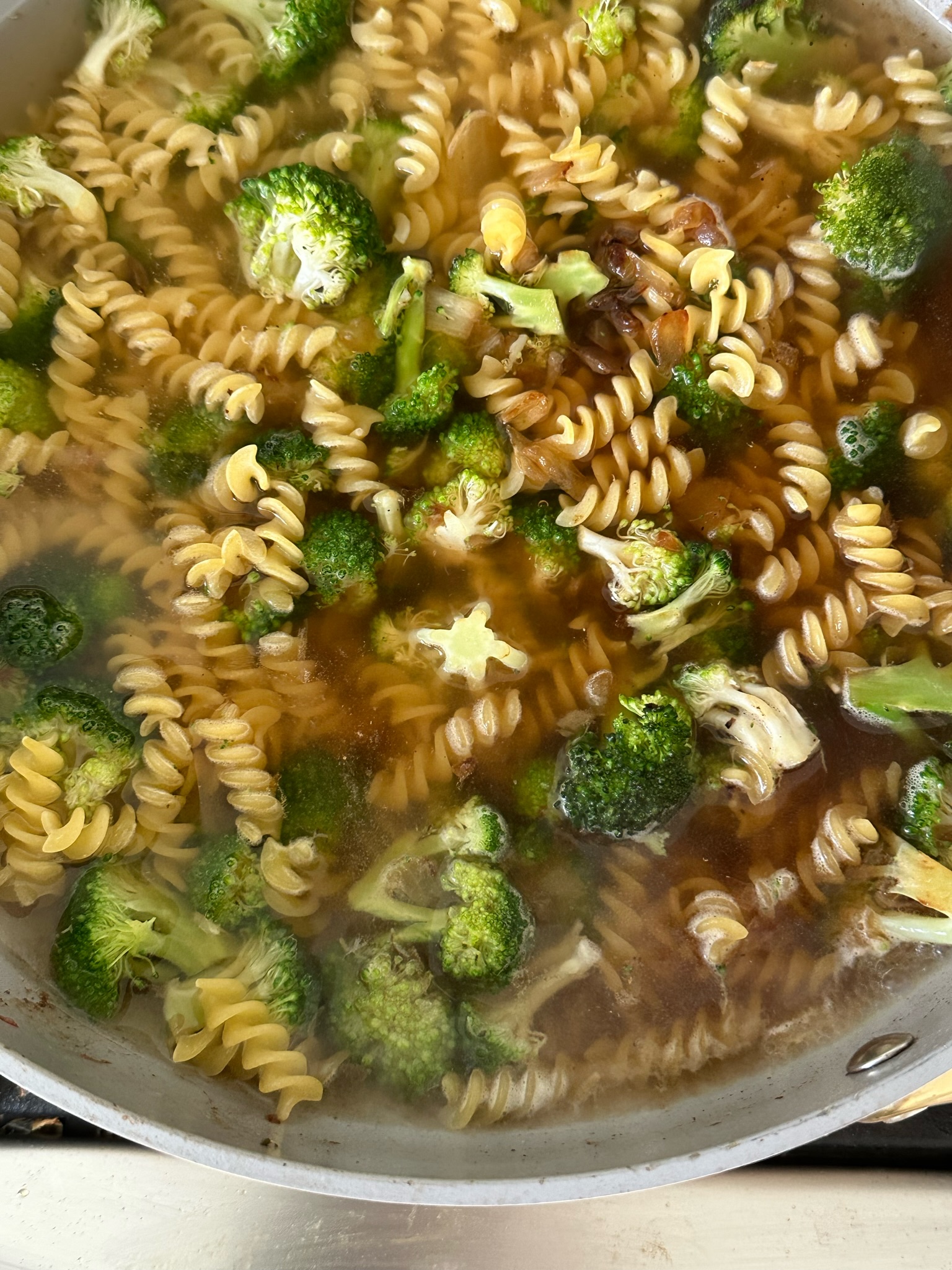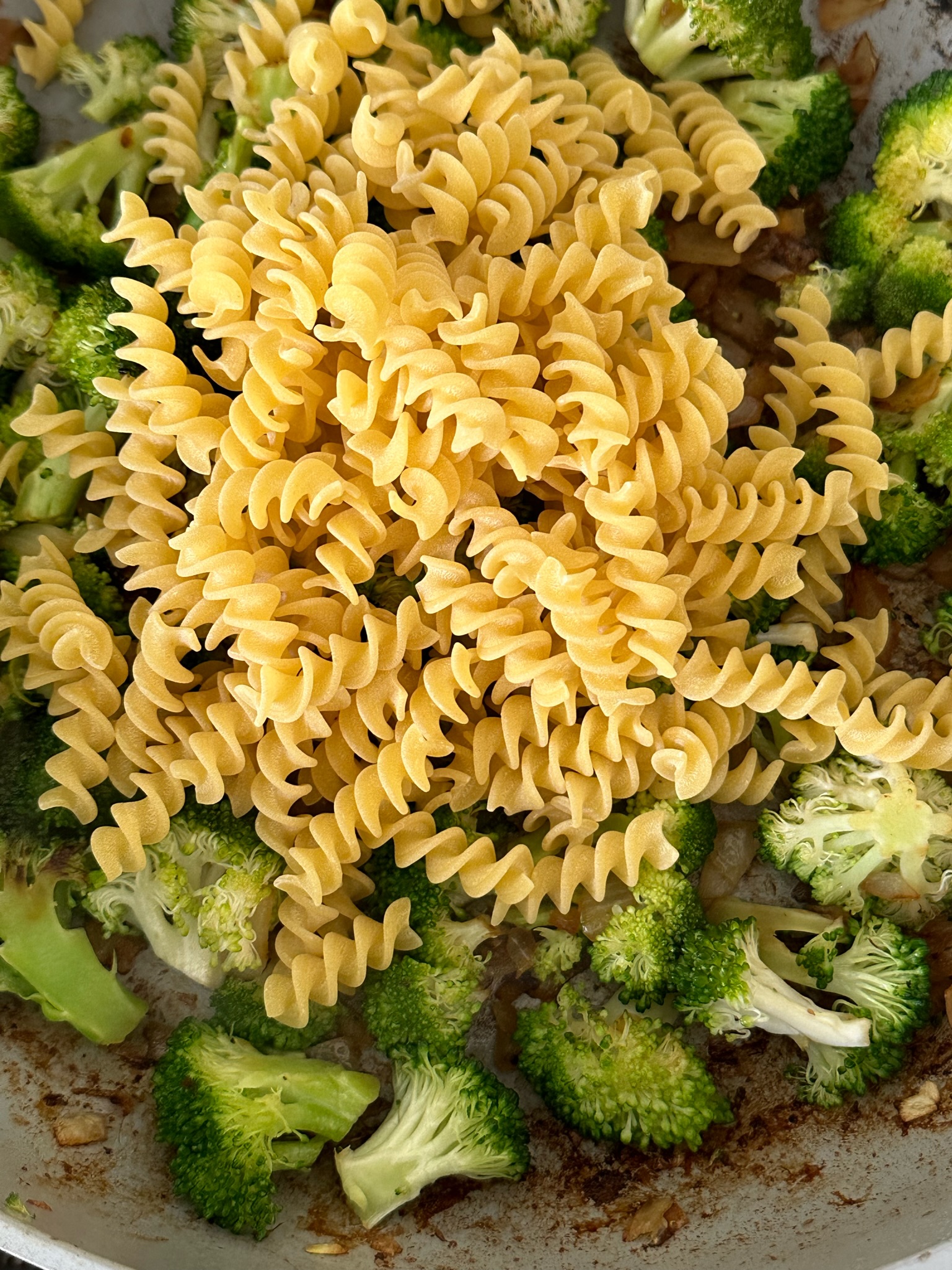 Once the chicken is set aside, saute your diced onion and broccoli florets in the same pan. Then add the dry pasta and 4 cups water to the pan then cover with a lid. Stir every so often and check to ensure that it’s thoroughly cooked!