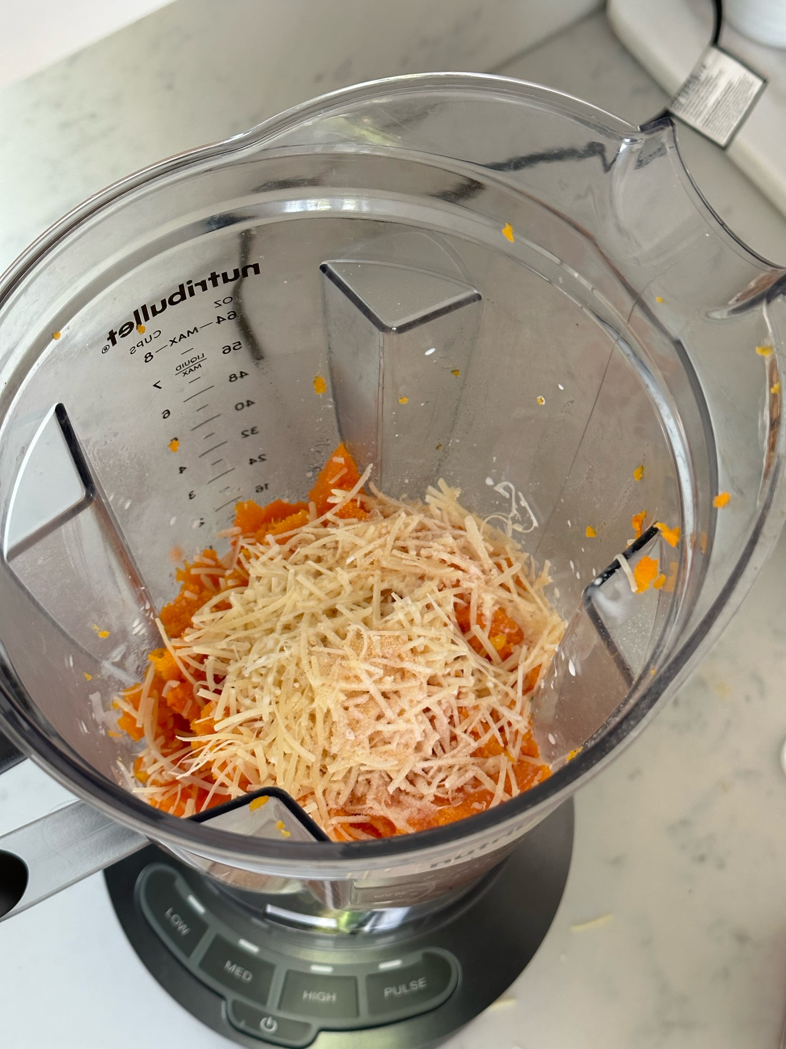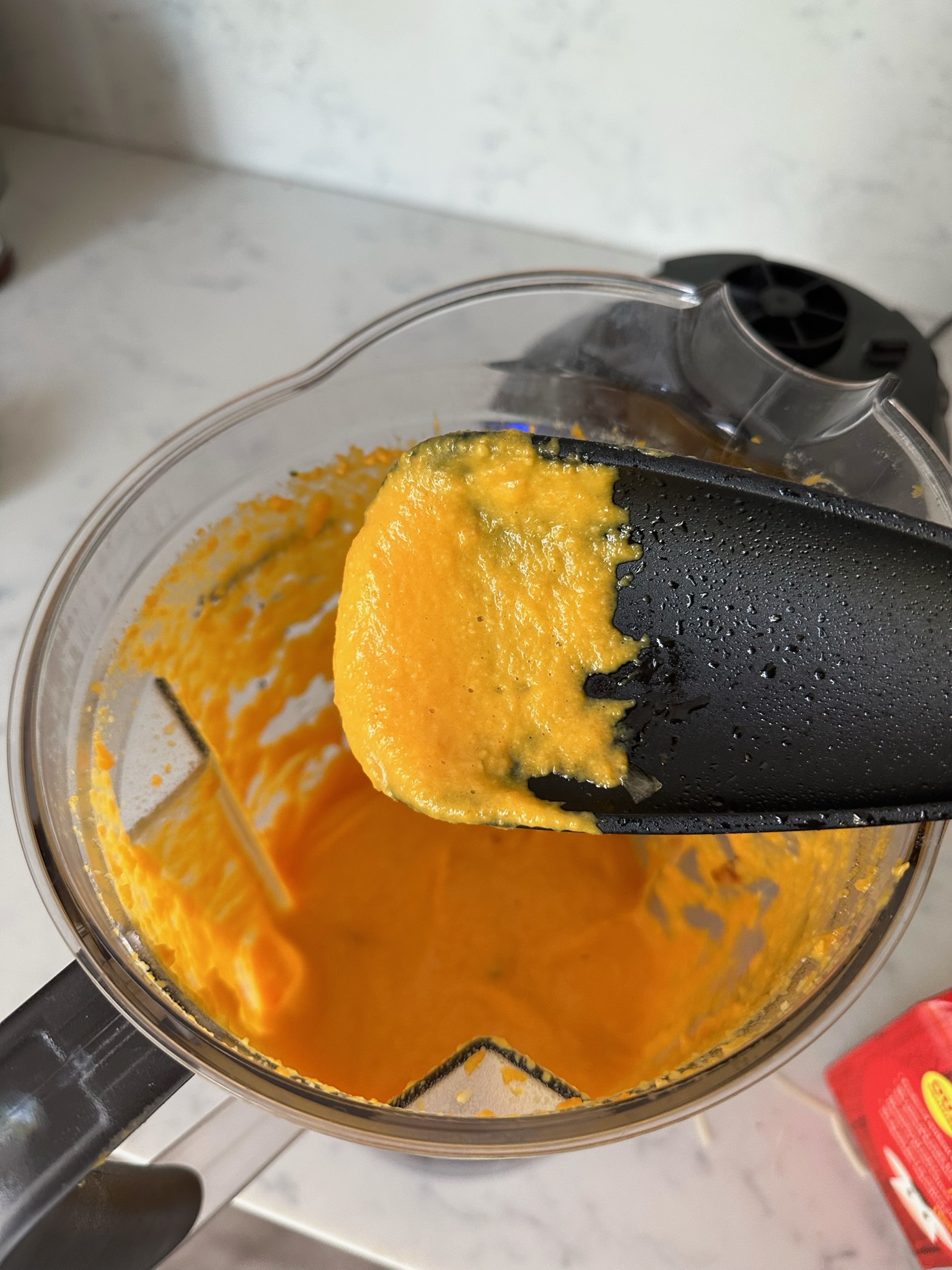 It’s time to make your sauce! Scoop out the insides of cooked butternut squash into the blender. (I cook the whole squash to have, but you only need 1/2 for the sauce)