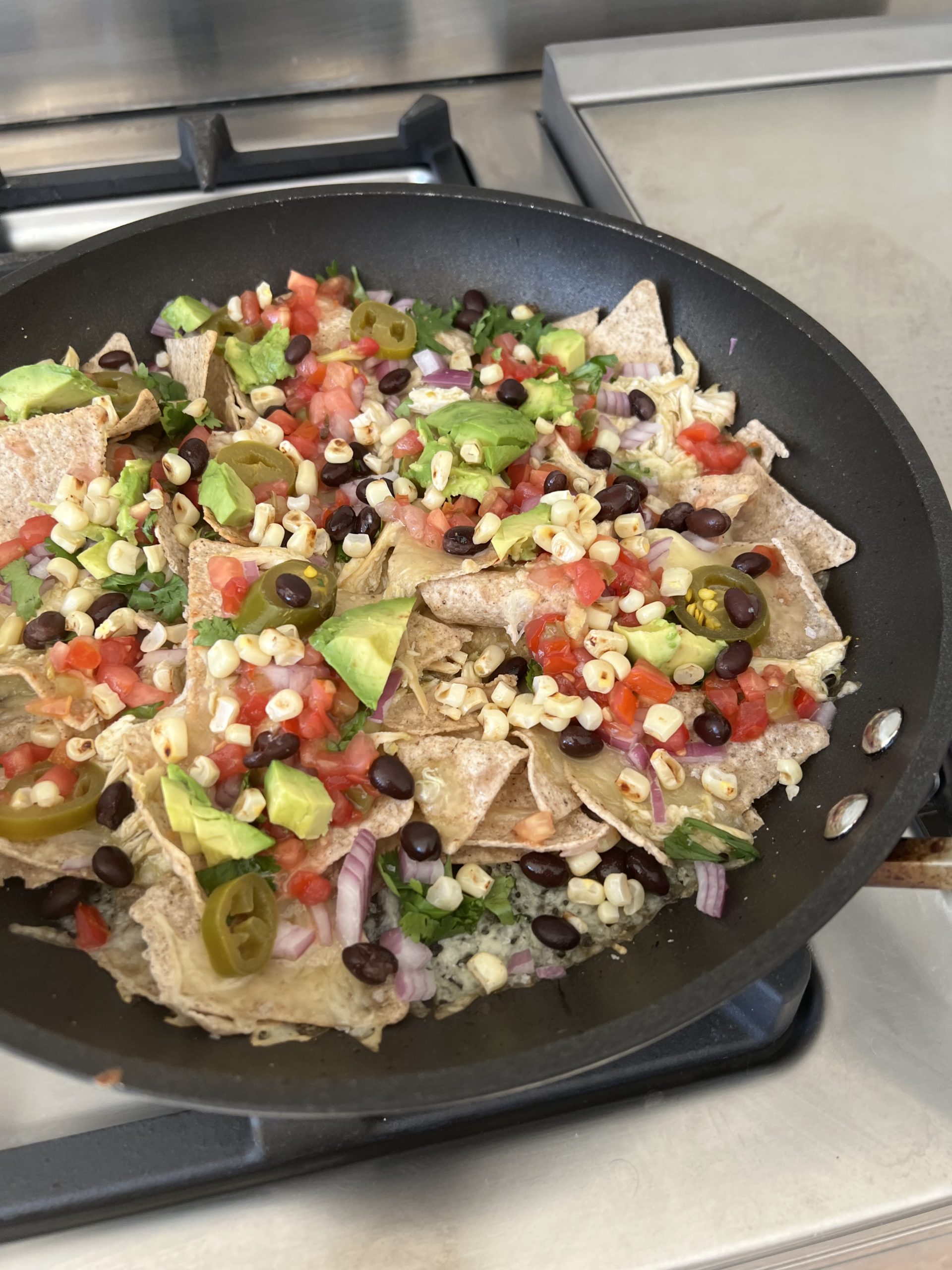 Next, take a cast iron skillet and add one layer of chips to the bottom. Then add 1/2 of the chicken and enchilada sauce mixture. Then add another layer of chips and add the remaining chicken mixture. Add corn and black beans and then bake for about 5 minutes at 450 degrees or until the cheese has completely melted.