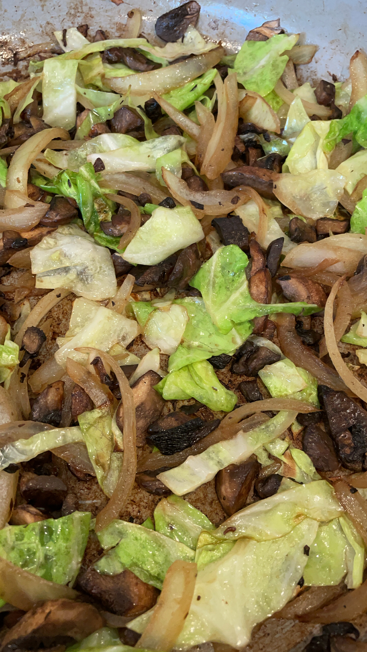 In the same frying pan, add garlic, onion, mushrooms and cabbage and sauté until veggies are softened and browned. Add salt and pepper to taste!