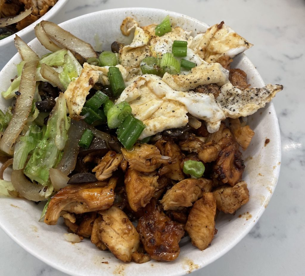 Add rice to a bowl, add soy sauce to rice, then add chicken and veggies. Top with fried egg and green onion. ENJOY!!
