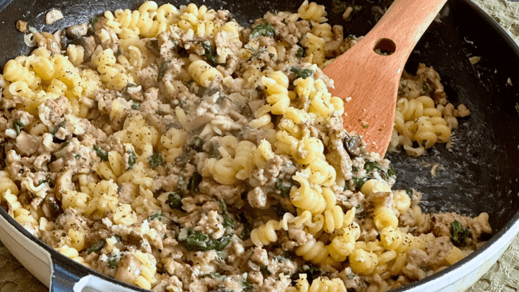 In this week’s episode, we’re bringing you one of the EASIEST dinners ever! In this show, I wanted to bring you all REALISTIC quick, simple recipes to feed your fam, and this pasta dish is just that. One pot is wonderful for an easy clean up. You can truly mix and match this pasta with different vegetables or proteins of your choice, too! I used ground turkey, but ground beef, sausage, ground chicken would all work, and so would peppers, zucchini, broccoli- this is one of my FAV ways for a fridge clean out dinner that actually can feed the fam.