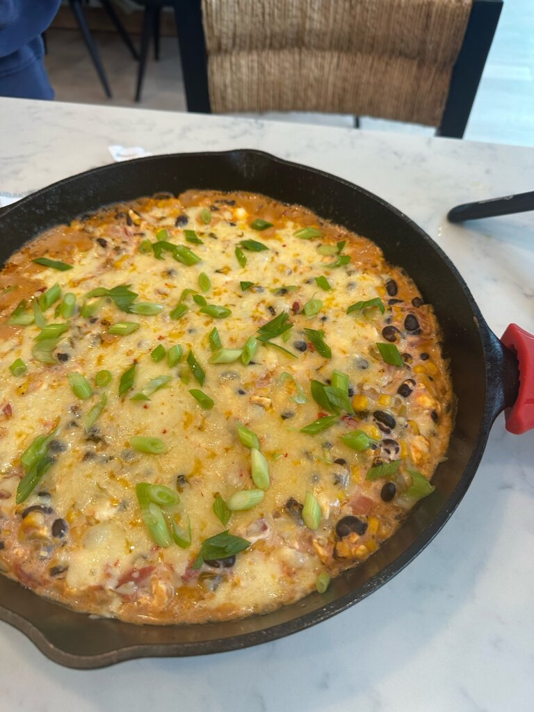 Once smooth, gently stir in the corn, beans, and 1/2 cup of the cheese. Pour the mixture into an oven-proof skillet or baking dish and top with the remaining cheese.