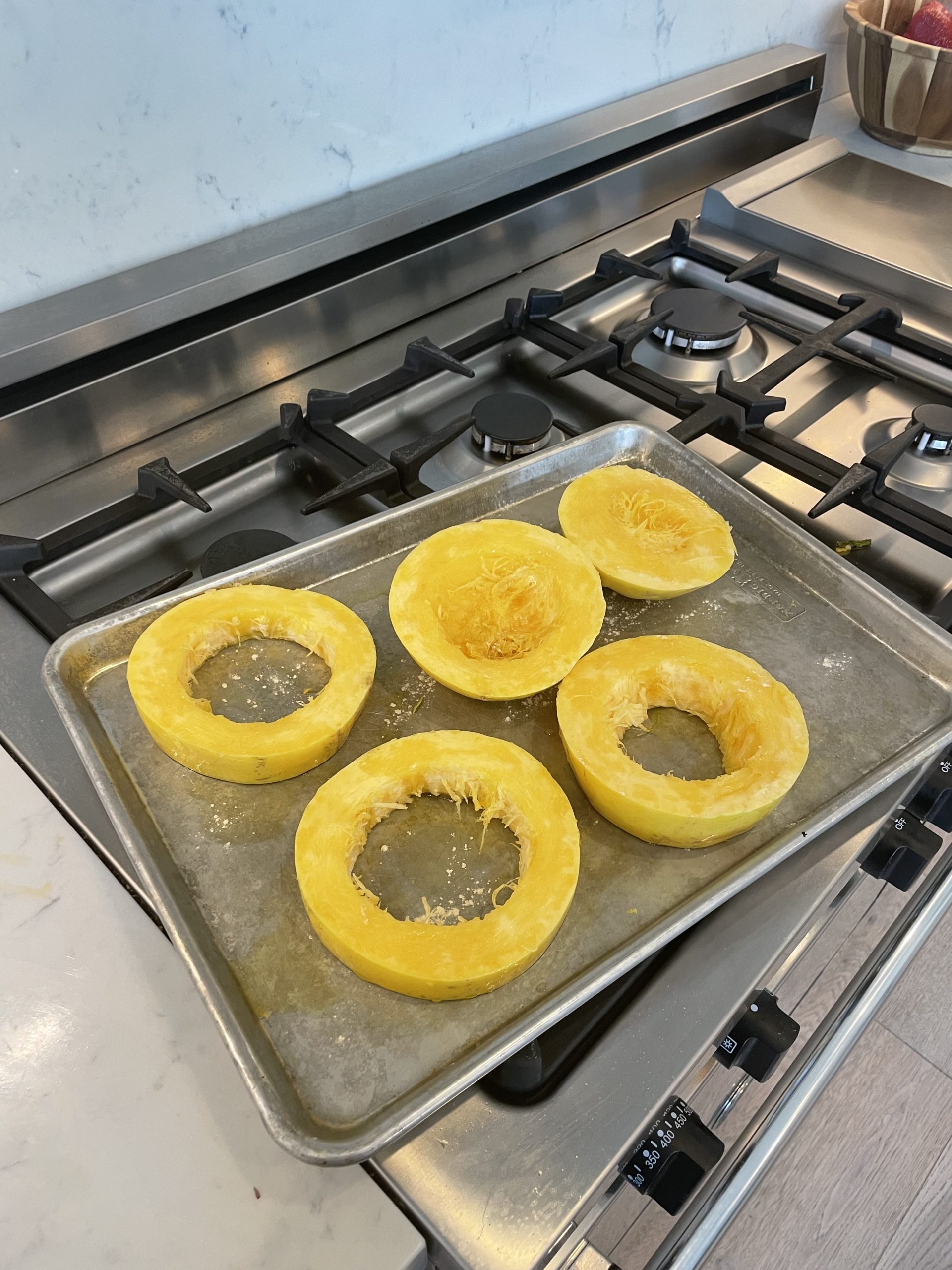 Bake your spaghetti squash: first microwave the spaghetti squash for 2 minutes so its easier to slice. Then cut into approximately 1 inch thick slices and top with olive oil, garlic powder and salt. Bake at 375 for 45 minutes.