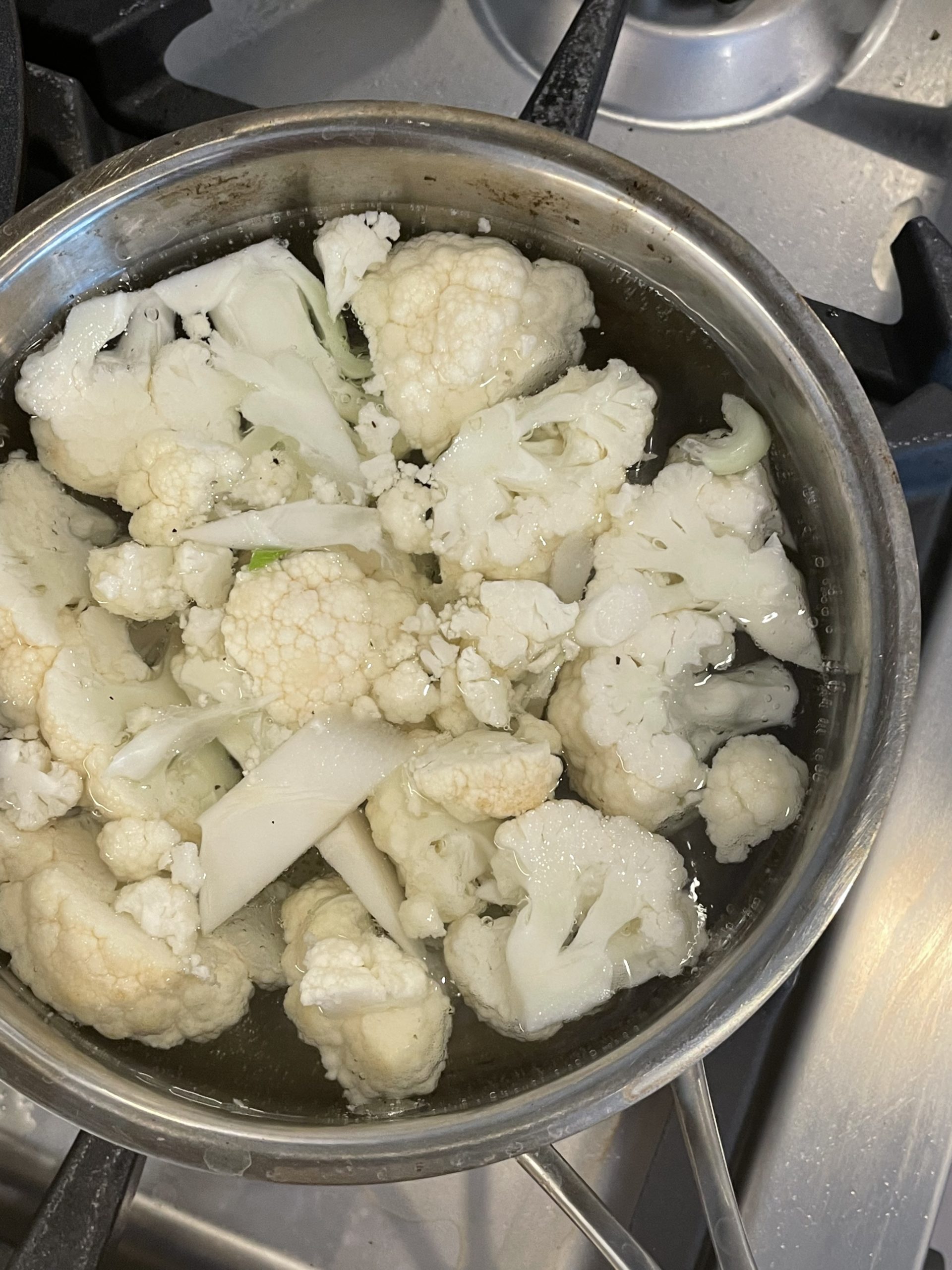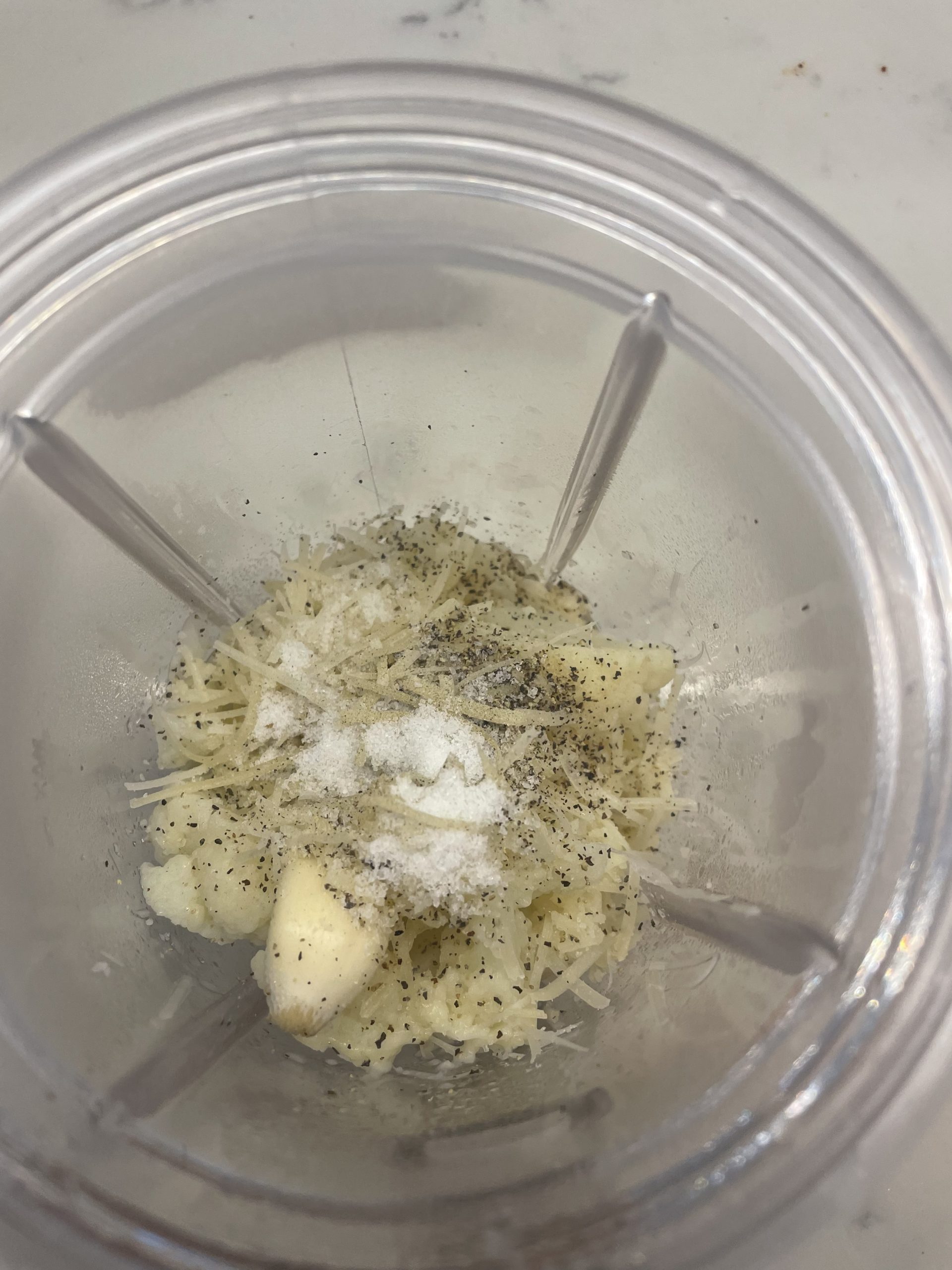Next it’s time to make your cream sauce: start by boiling your cauliflower until it is fork tender, approximately 10 minutes. Then add the boiled cauliflower to a blender or food processor with a little bit of the water that you boiled it in, pepper, salt, 1 garlic clove and a handful of parmesan cheese.