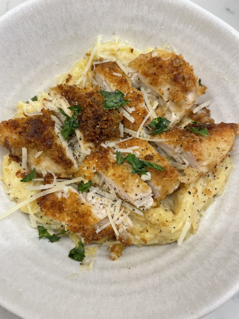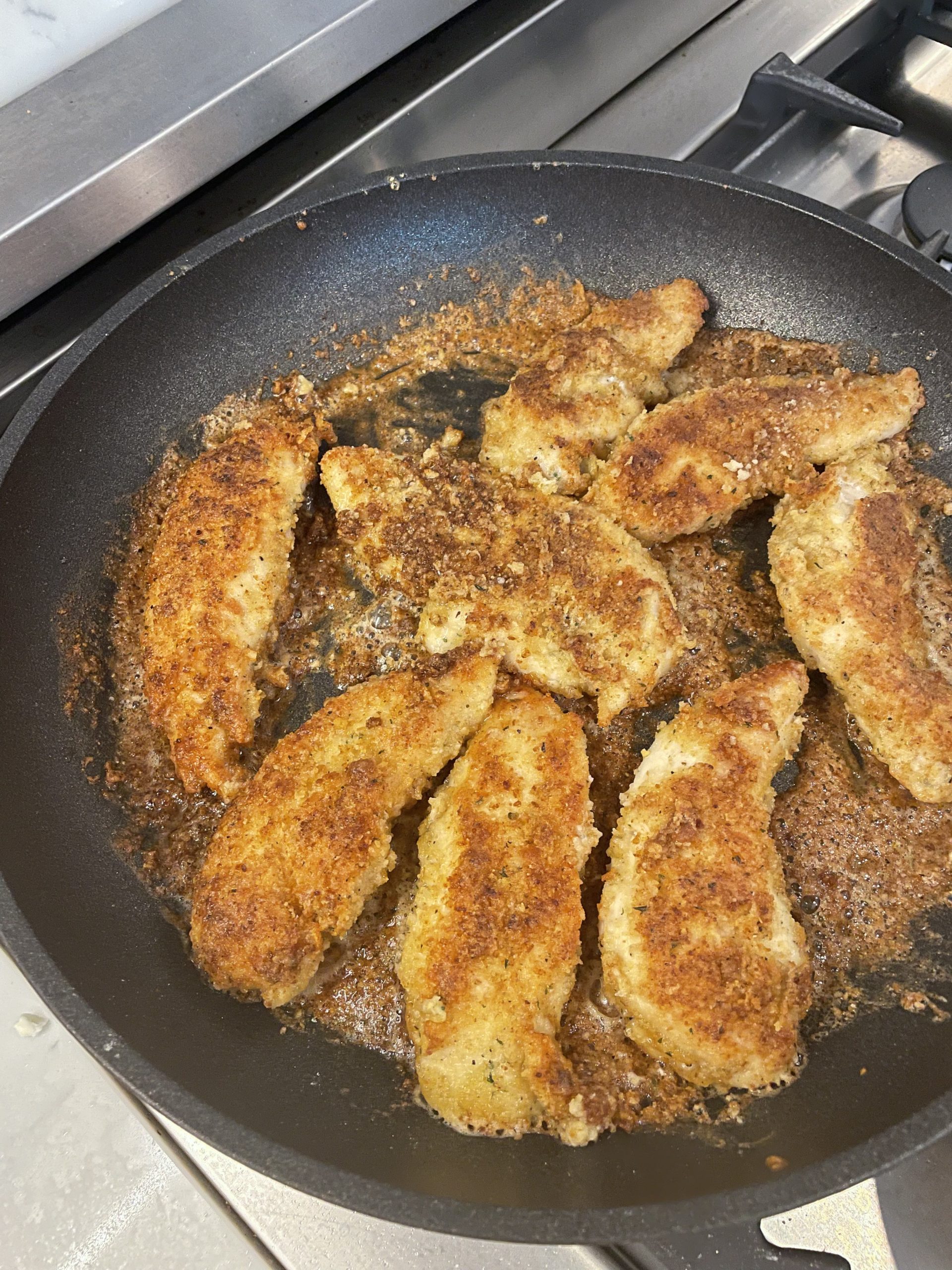 While the squash is cooking it’s time to fry up the chicken: in one bowl, whisk 2 eggs. In another bowl, mix flour and breadcrumbs. Then dip each chicken tender into an egg wash and then directly into the flour/breadcrumb mixture. Fry in olive oil for about 5 minutes on each side. Be sure to cut through your thickest piece to ensure the chicken is fully cooked!