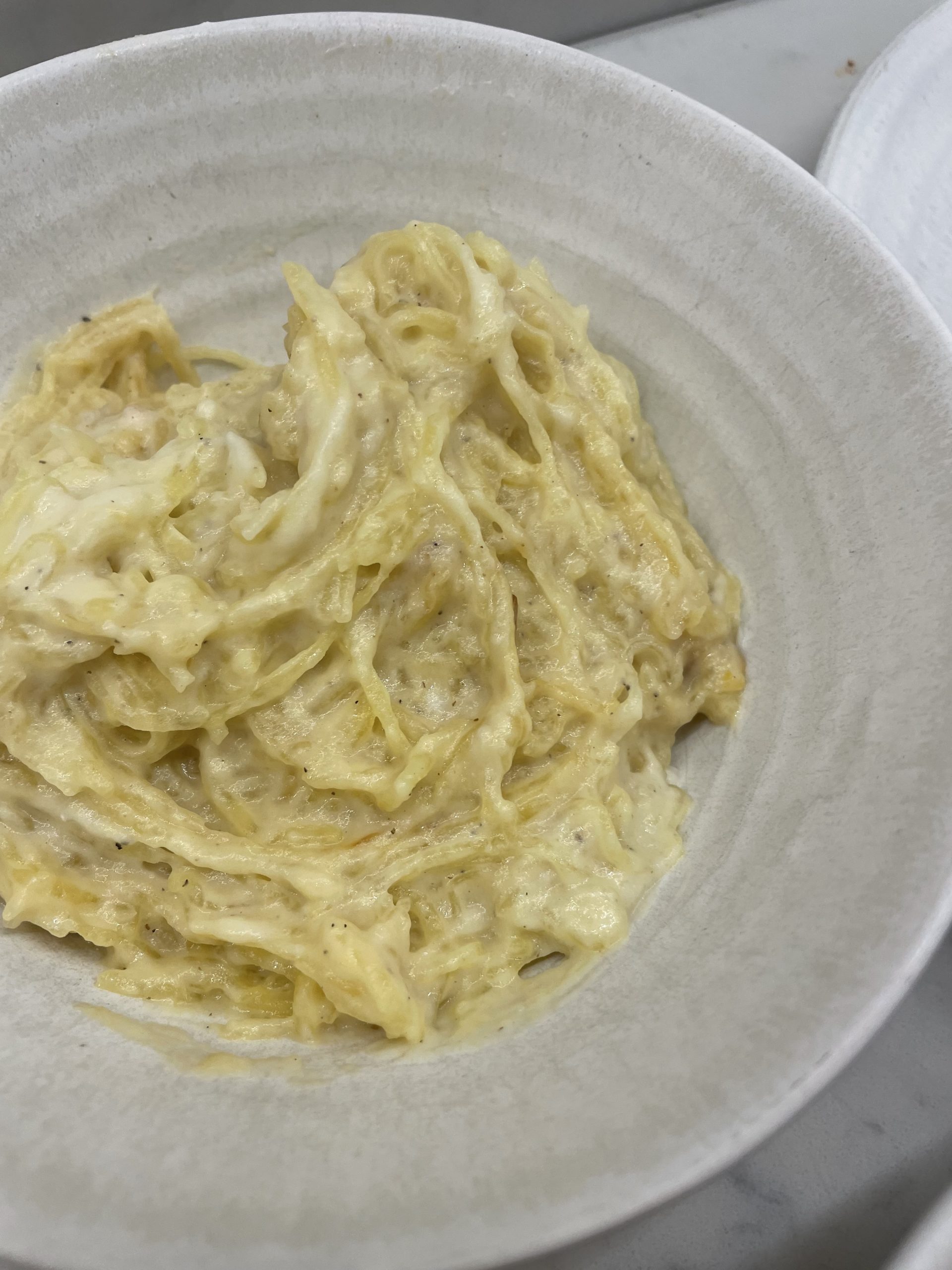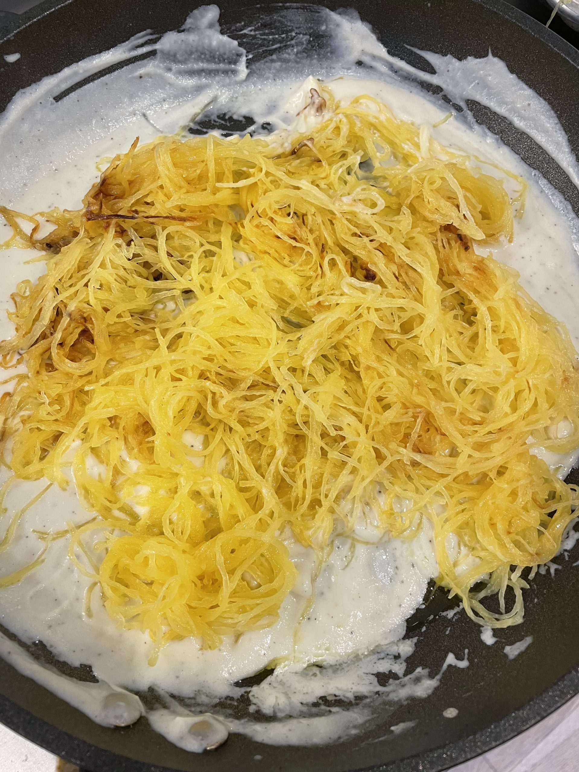 After the squash is baked, pull it apart with a fork to make it into spaghetti and then add to the cauliflower cream sauce