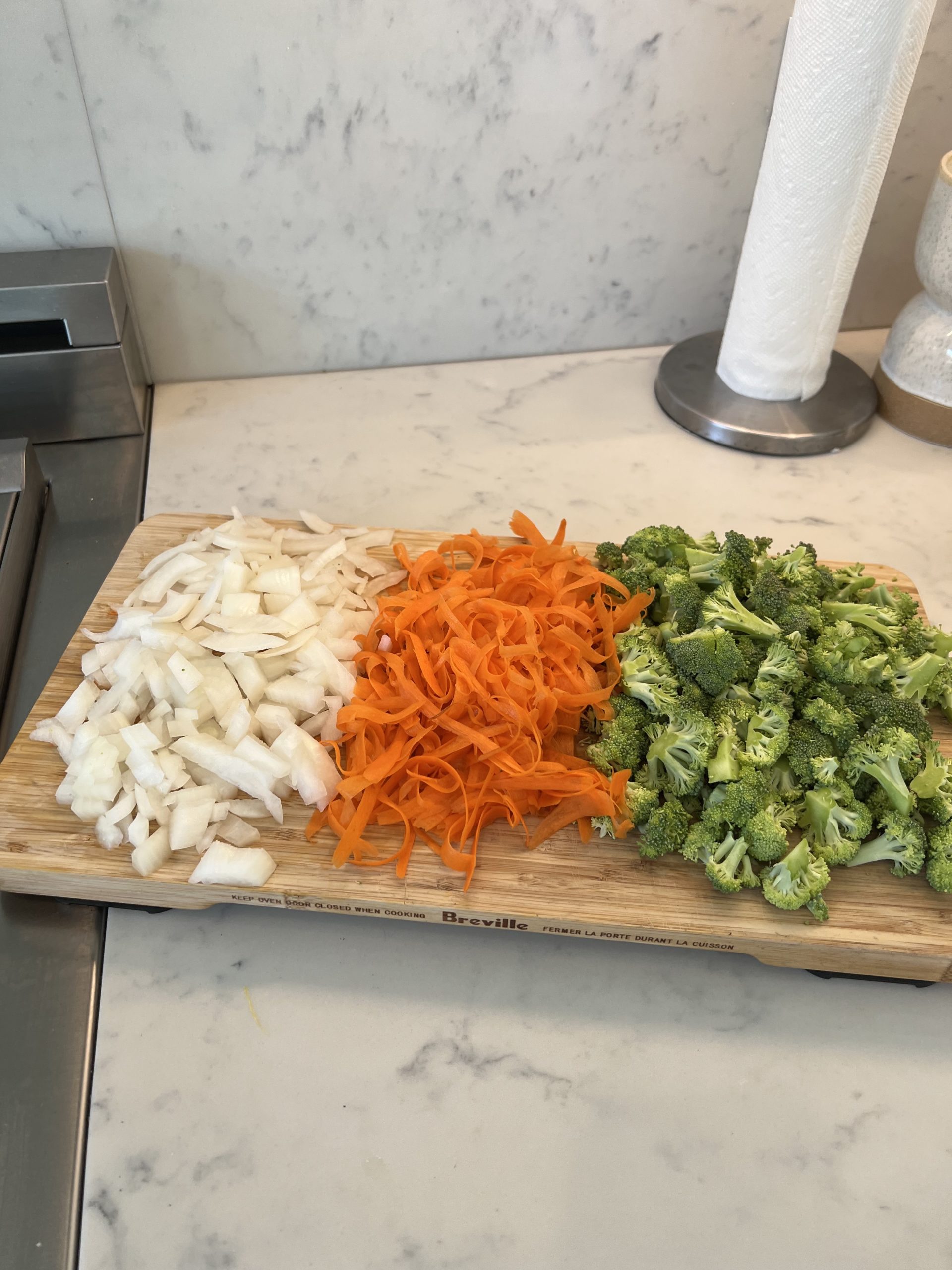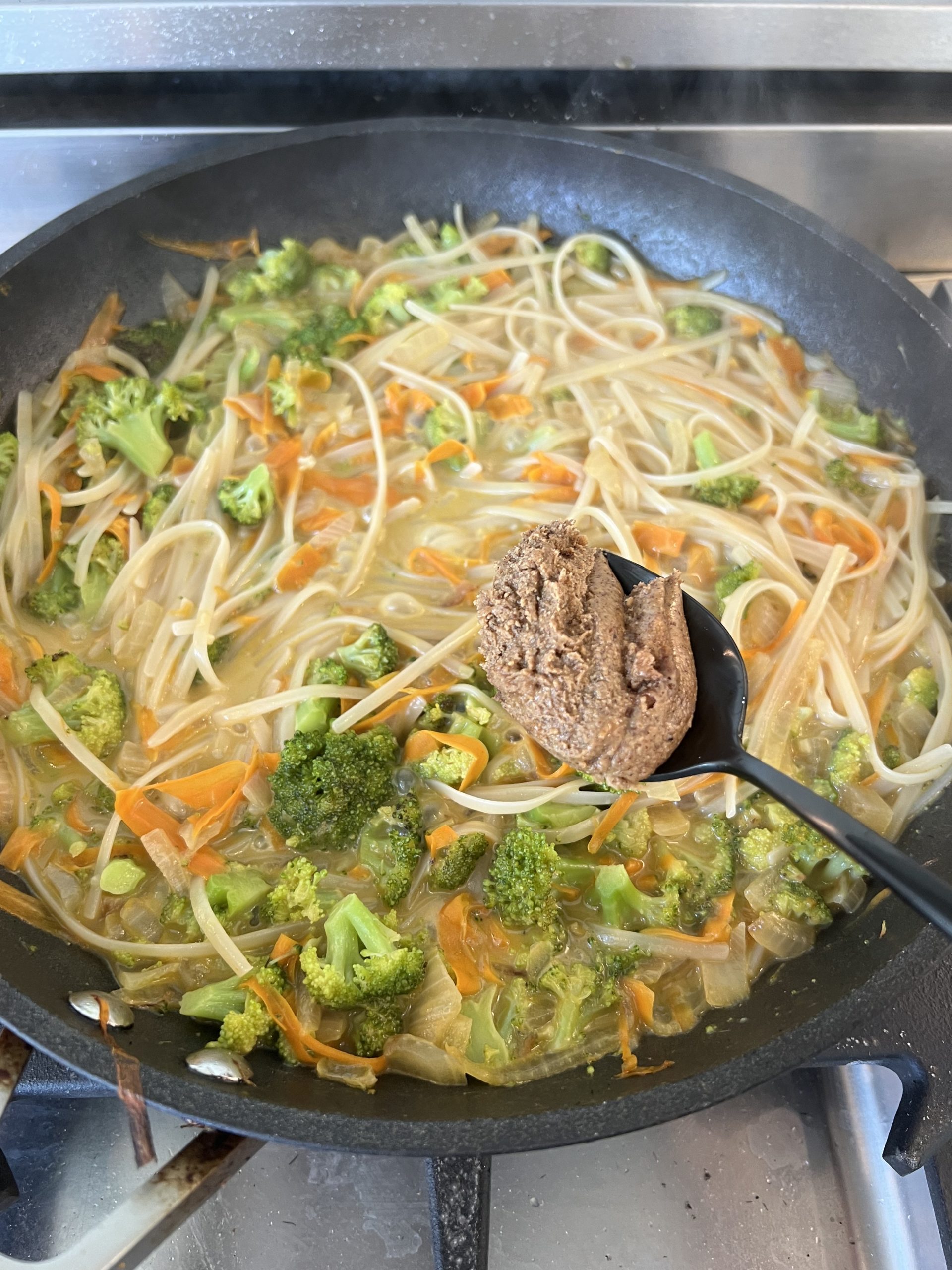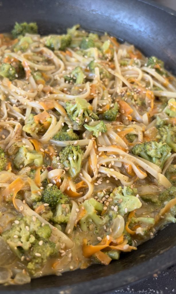 I sautéed brocoli, carrots and onion with a little garlic. Then I added some water and coconut milk, added the Thai noddles and covered. I added a scoop of peanut butter, soy sauce, red pepper flakes, sesame seeds, onion and garlic powder.