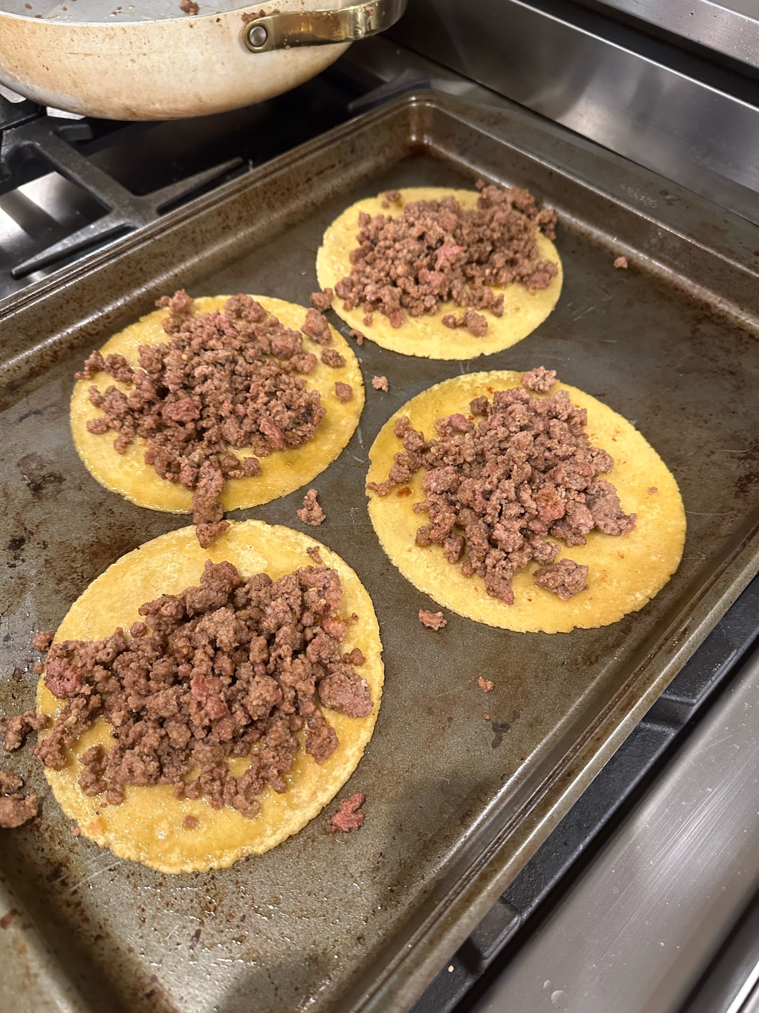 Put the tortillas covered with a little bit of olive oil on a baking tray, and add a little bit of your cooked ground beef to each tortilla. Add your red onion and cheese! Fold over and place in the oven.