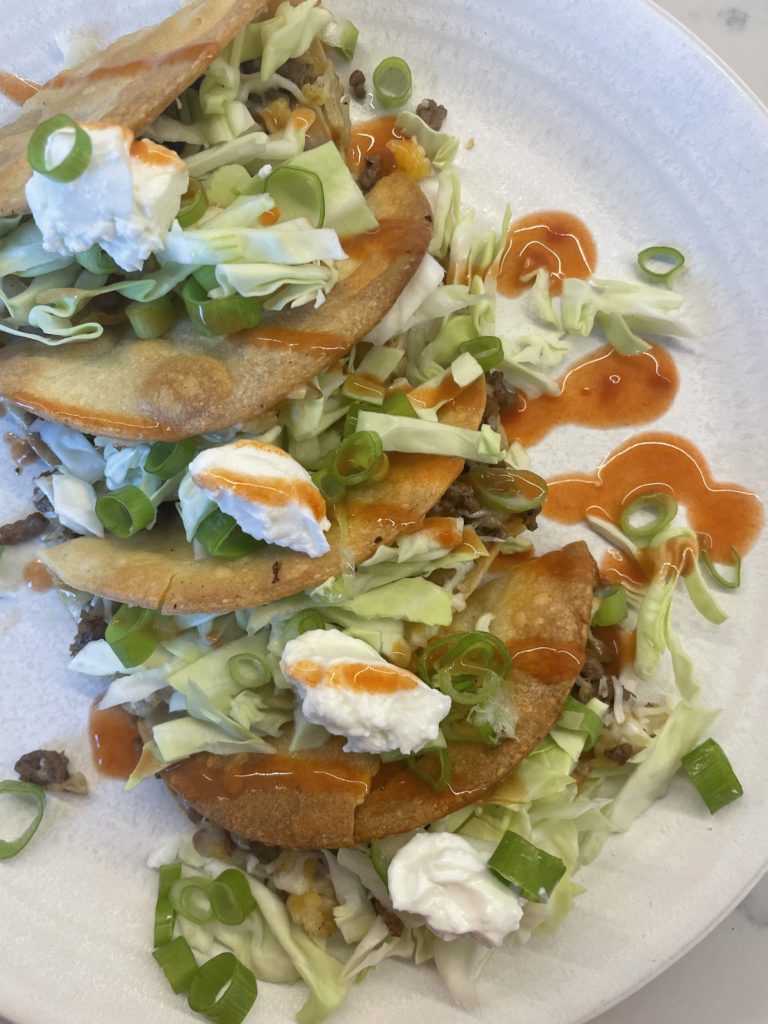 Then top with shredded lettuce, green onion, avocado, hot sauce and I suggest using greek yogurt as sour cream!