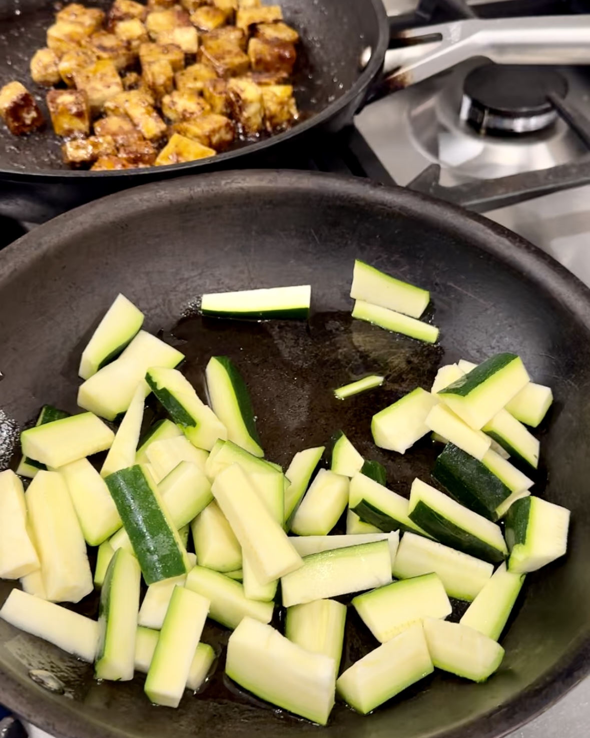 Dice the zucchini into smaller pieces and add to the skillet over medium to high heat. Sauté for 5-6 minutes or until the zucchinis are tender.