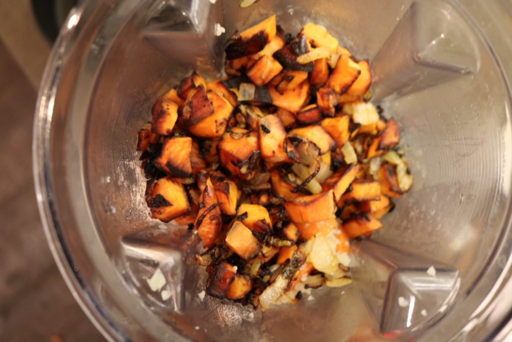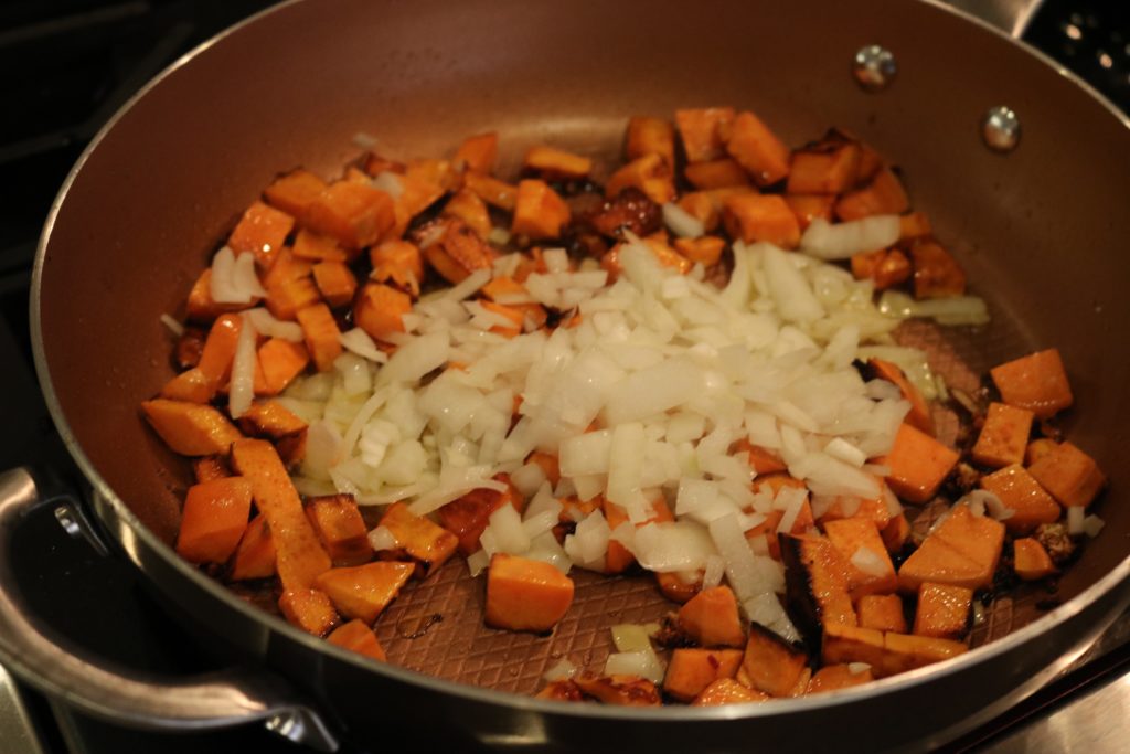 Cut up the sweet potato and onions, and saute them with garlic and a touch of olive oil.