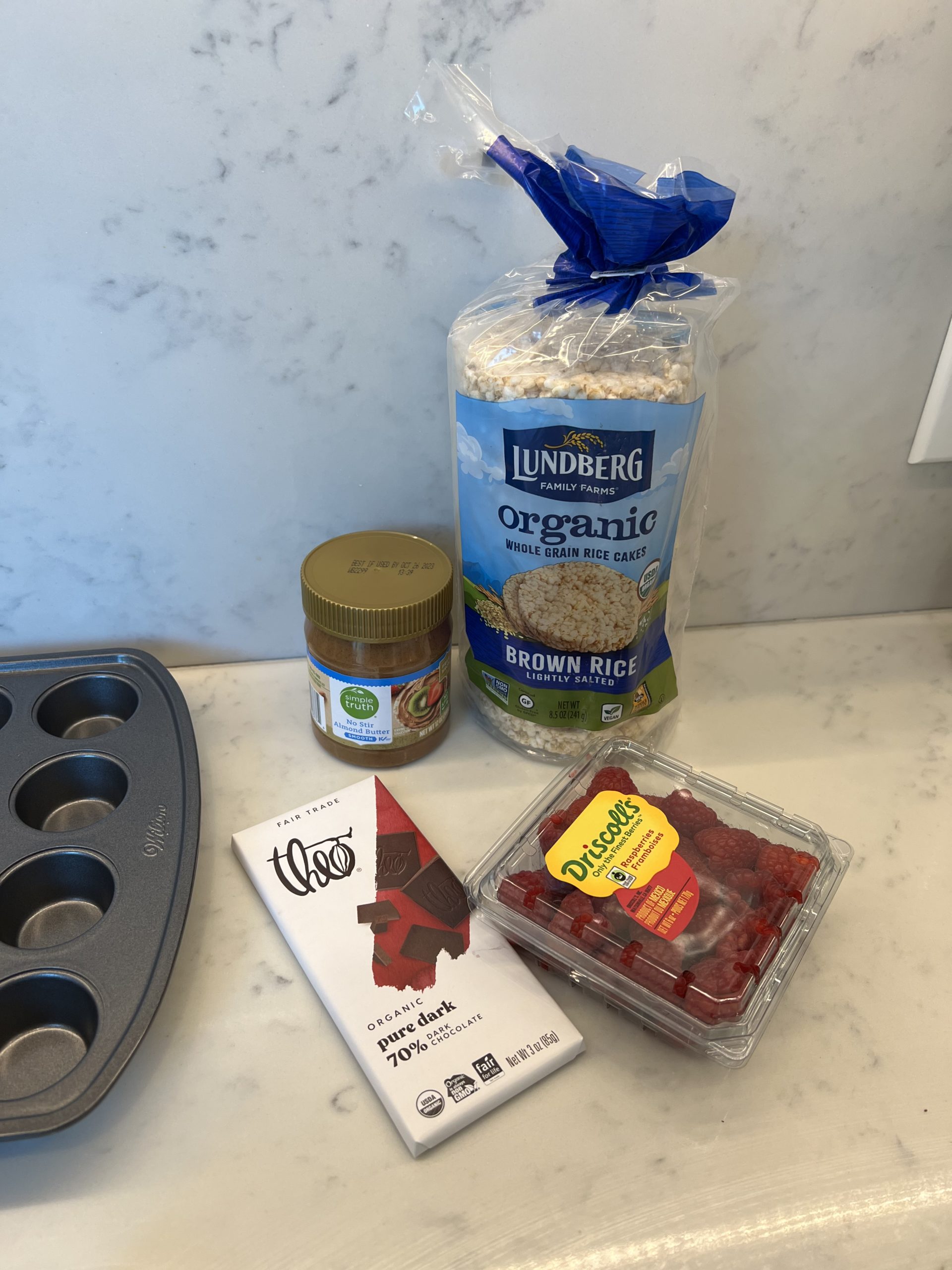 Crush up your two rice cakes, then break apart your dark chocolate bar so it’s easier to melt!