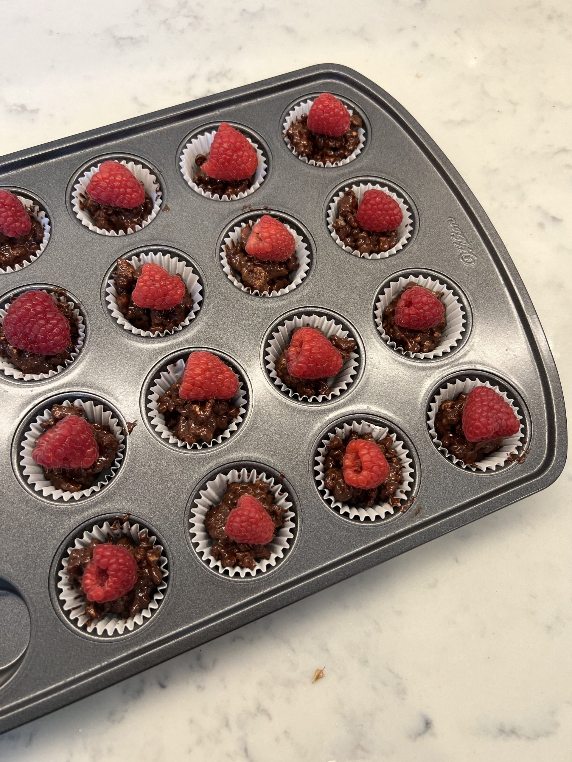 Top each tin with a raspberry and place in the fridge to harden for at least 30 minutes!