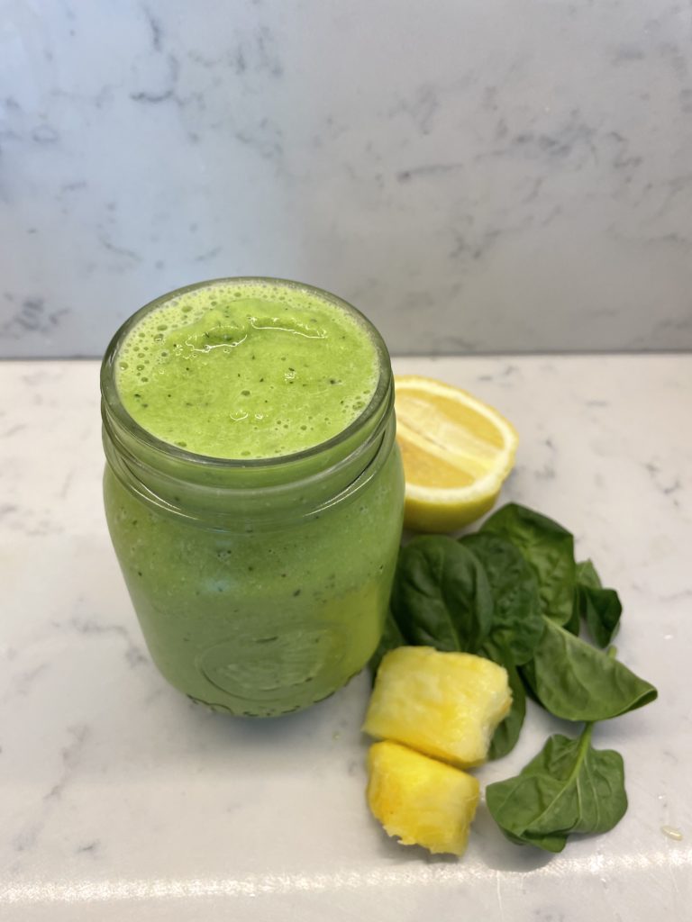 1 cup Ice1/2 Cucumber1/3 cup pineapple1/2 banana1/3 cup Greek yogurt1 cup spinach1/2 lemon squeezed1/3 cup water