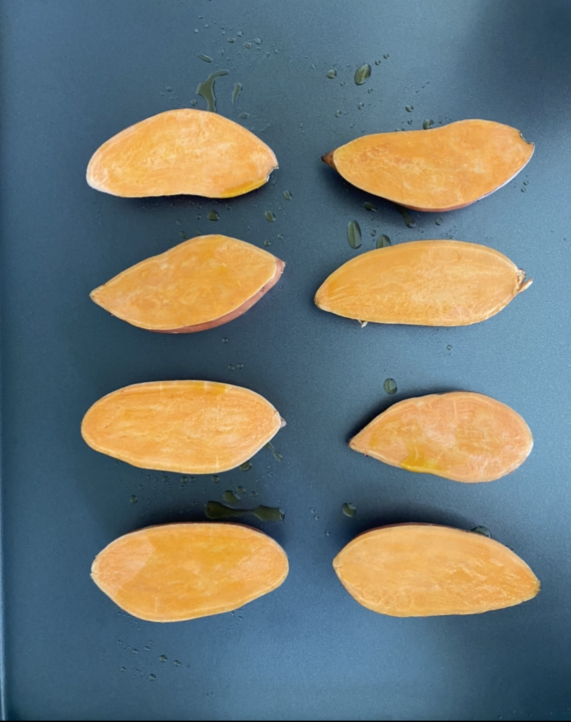 First, cut sweet potatoes in half and bake at 425 for 25 minutes or until fork tender
