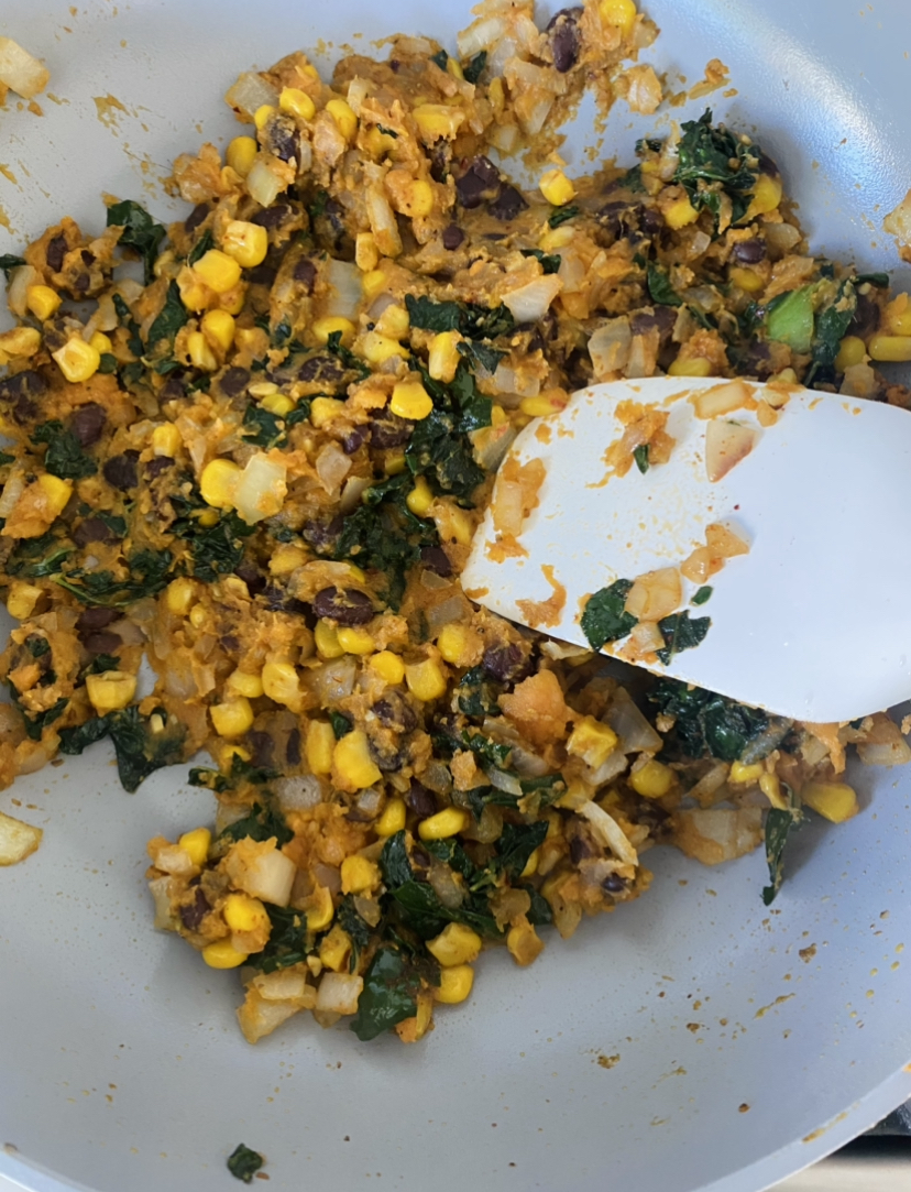 While the potatoes are in the oven cook onions, kale, corn and black beans in a pan on your stovetop