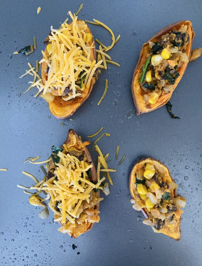 When the skins are nice and crispy, take them out of the oven and carefully scoop in your Mexican veggie mixture and top with shredded cheddar cheese!