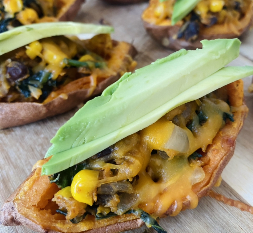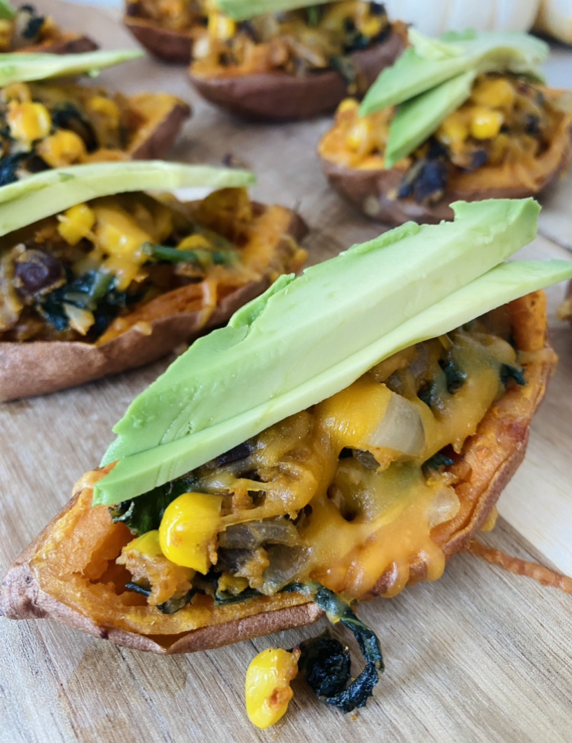 I love loaded potato skins but most of the time I feel extremely bloated after eating all the cheese, bacon and sour cream so I decided to make a healthier version of these with sweet potatoes and a veggie filling! They turned out SO GOOD and they are perfect for fall! Also a great app for football Sundays!