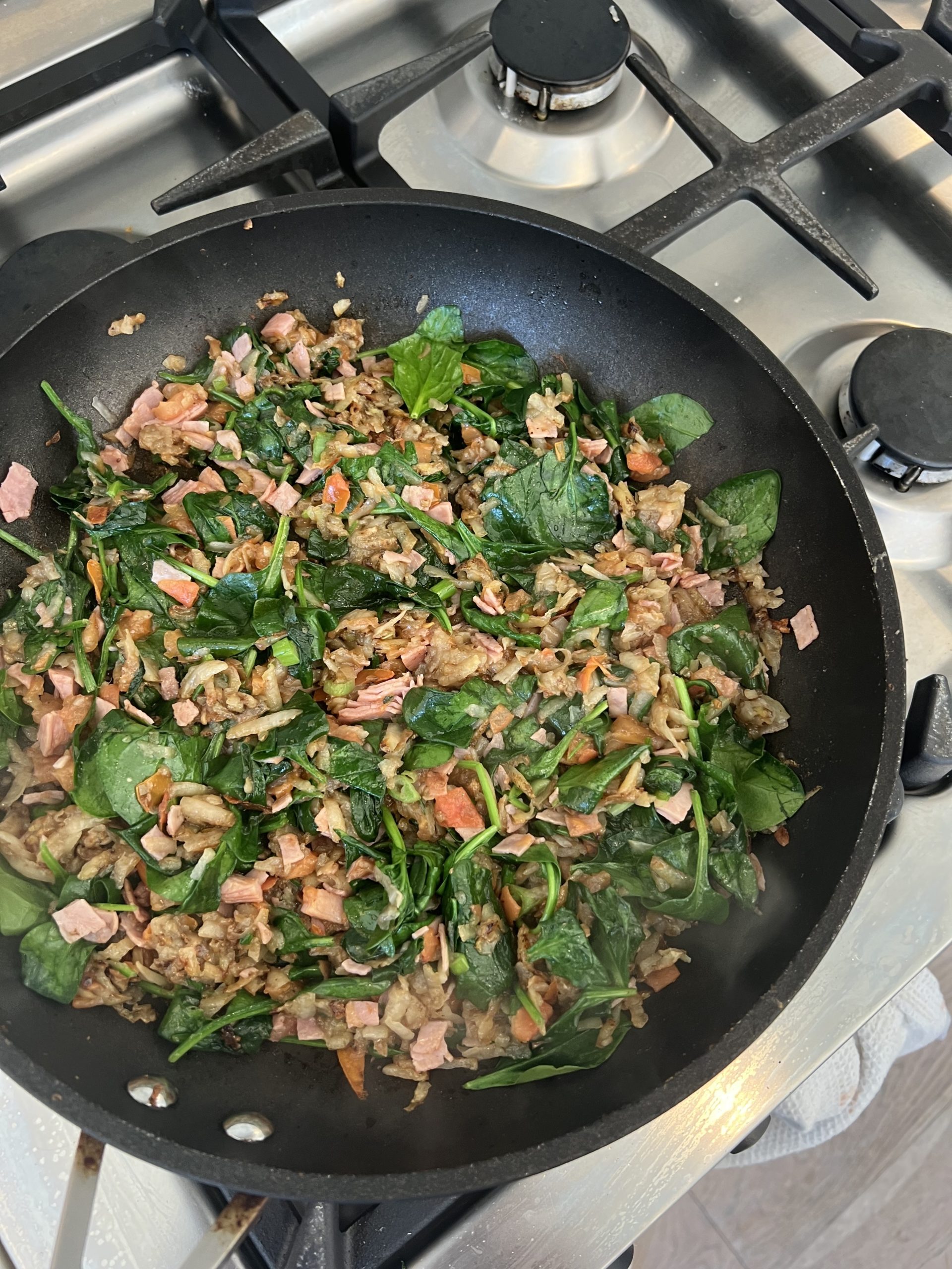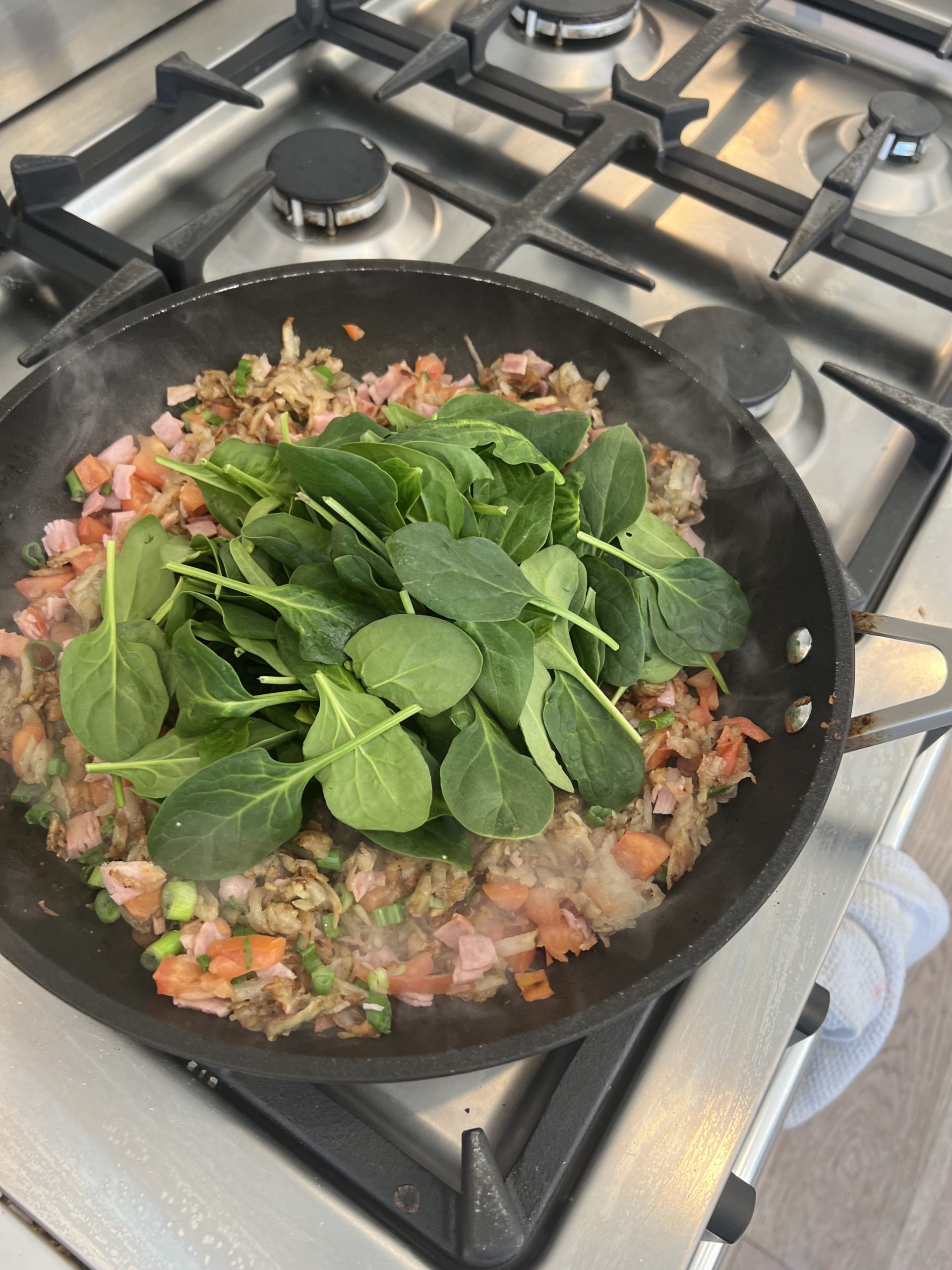 Add in your baby spinach and saute till wilted as well. If you have normal spinach on hand – don’t worry you don’t necessarily ~need~ baby spinach, I just find it easier for each bite. So, if you have normal sized spinach, what I like to do is tear them as I place them in the skillet so that they’re smaller and more bite sized!