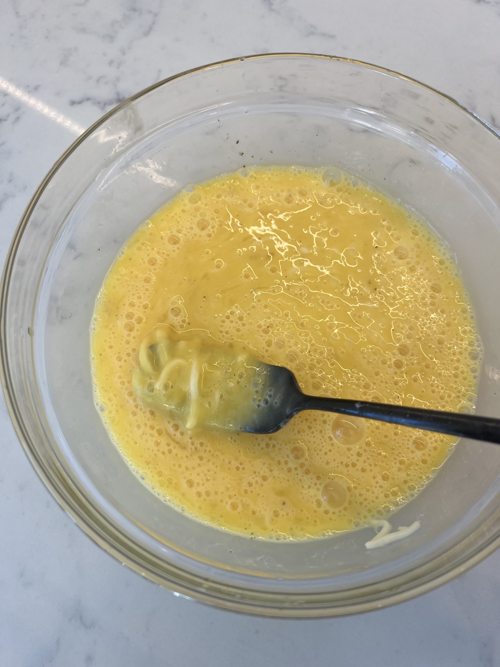 In a bowl, whisk your 12 eggs together with a pinch of salt and pepper to taste. Add in your 2/3 cup cheese to the eggs and mix well!