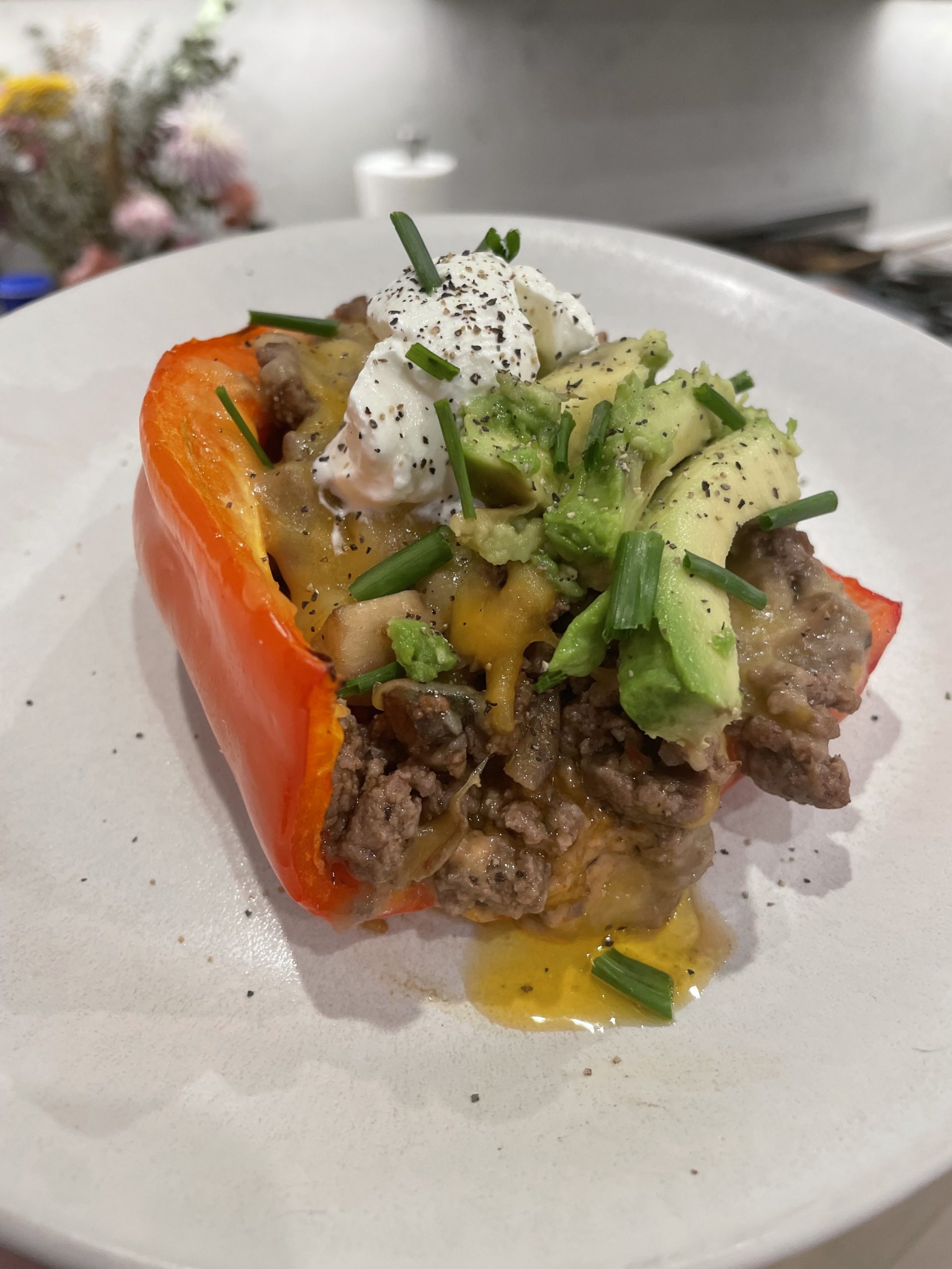 While the beef is cooking, cut your bell peppers in half and scoop out the seeds. Put the peppers on a baking sheet and drizzle with olive oil and bake in the oven for about 18-20 minutes at 400 degrees.