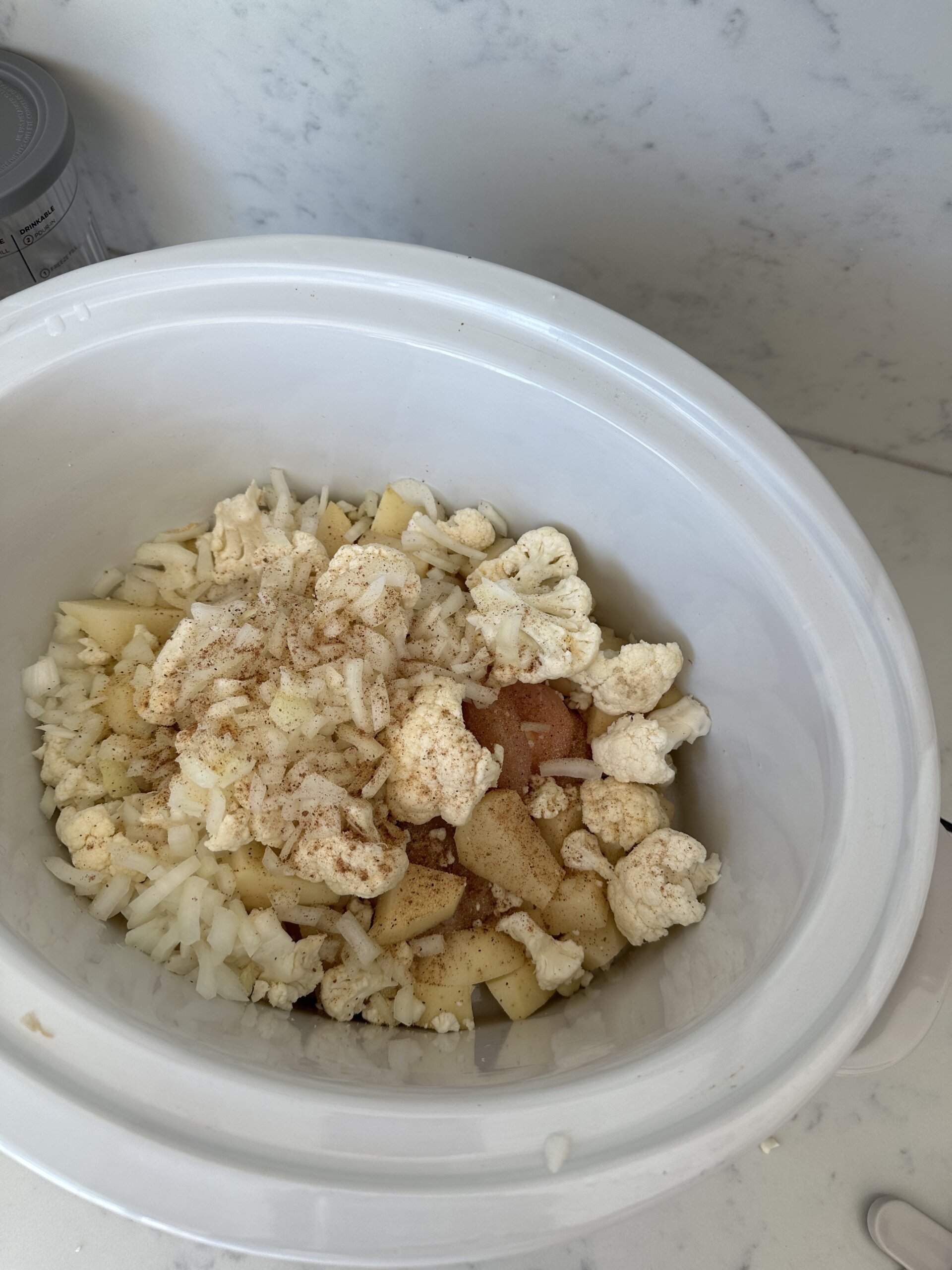 Add your chicken breast, potato, cauliflower, chicken broth, butter, onion, and seasonings to the slow cooker. Slow cook for 4 hours.