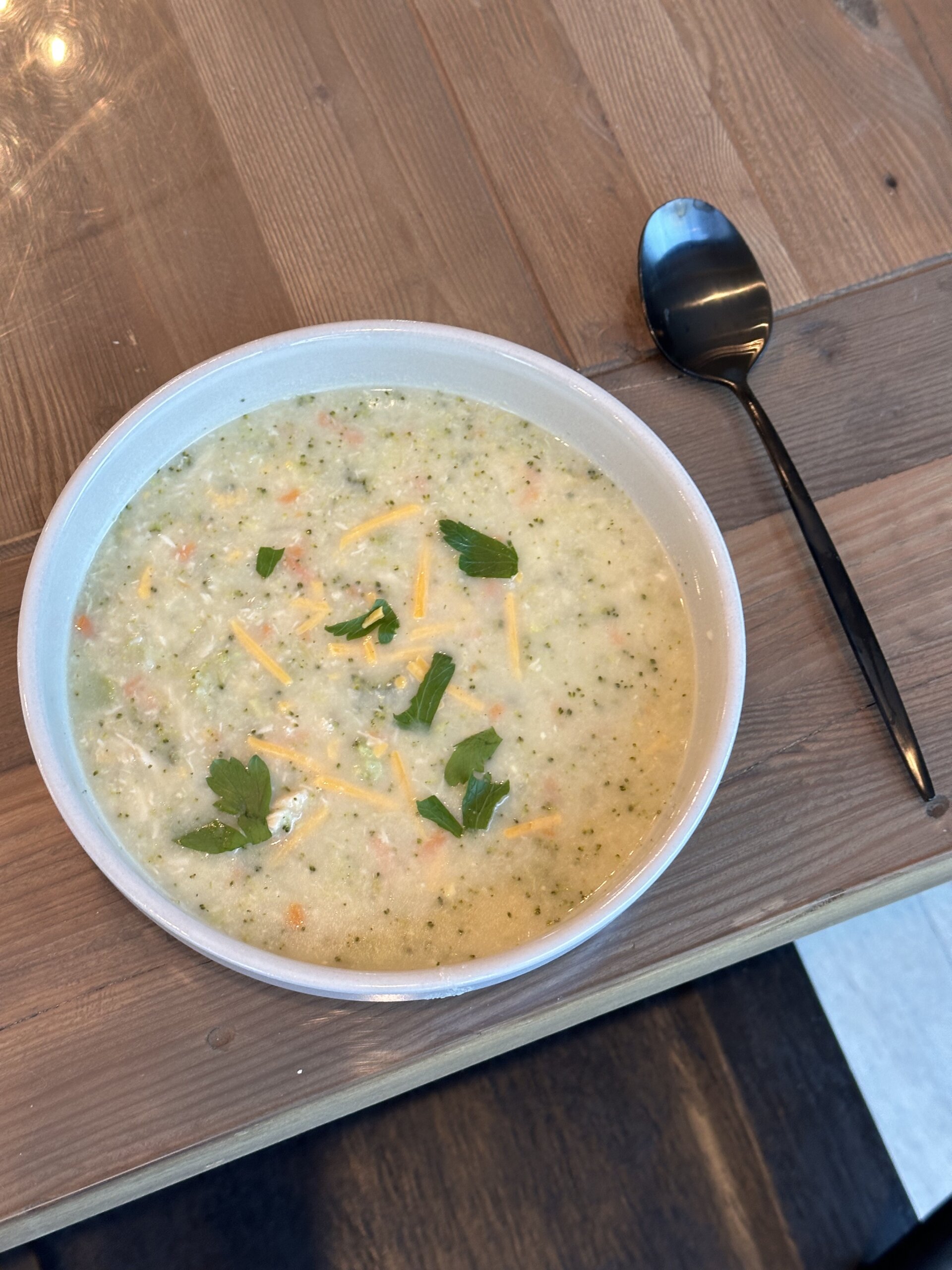 Sunday slow cooker soupš letās make creamy healthified chicken broccoli cheddar soup! Broccoli cheddar soup reminds me of my childhood, and always has the most comforting feeling! This version is higher in protein with the chicken, and it actually had FIVE different veggies in it- using the potato + cauliflower to make it creamy.