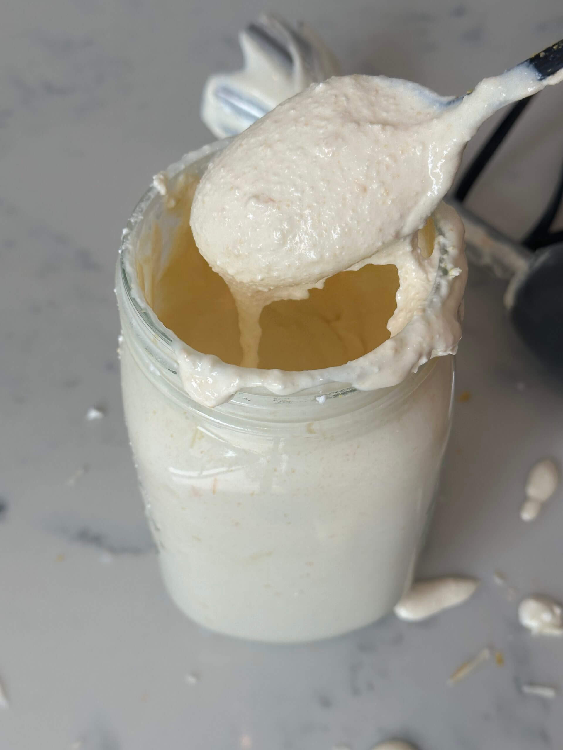 In a bowl or jar use an immersion blender to blend together your cottage cheese, Mexican cheese blend, nutritional yeast & water till smooth! If you don’t have an immersion blender – a normal blender works just the same!