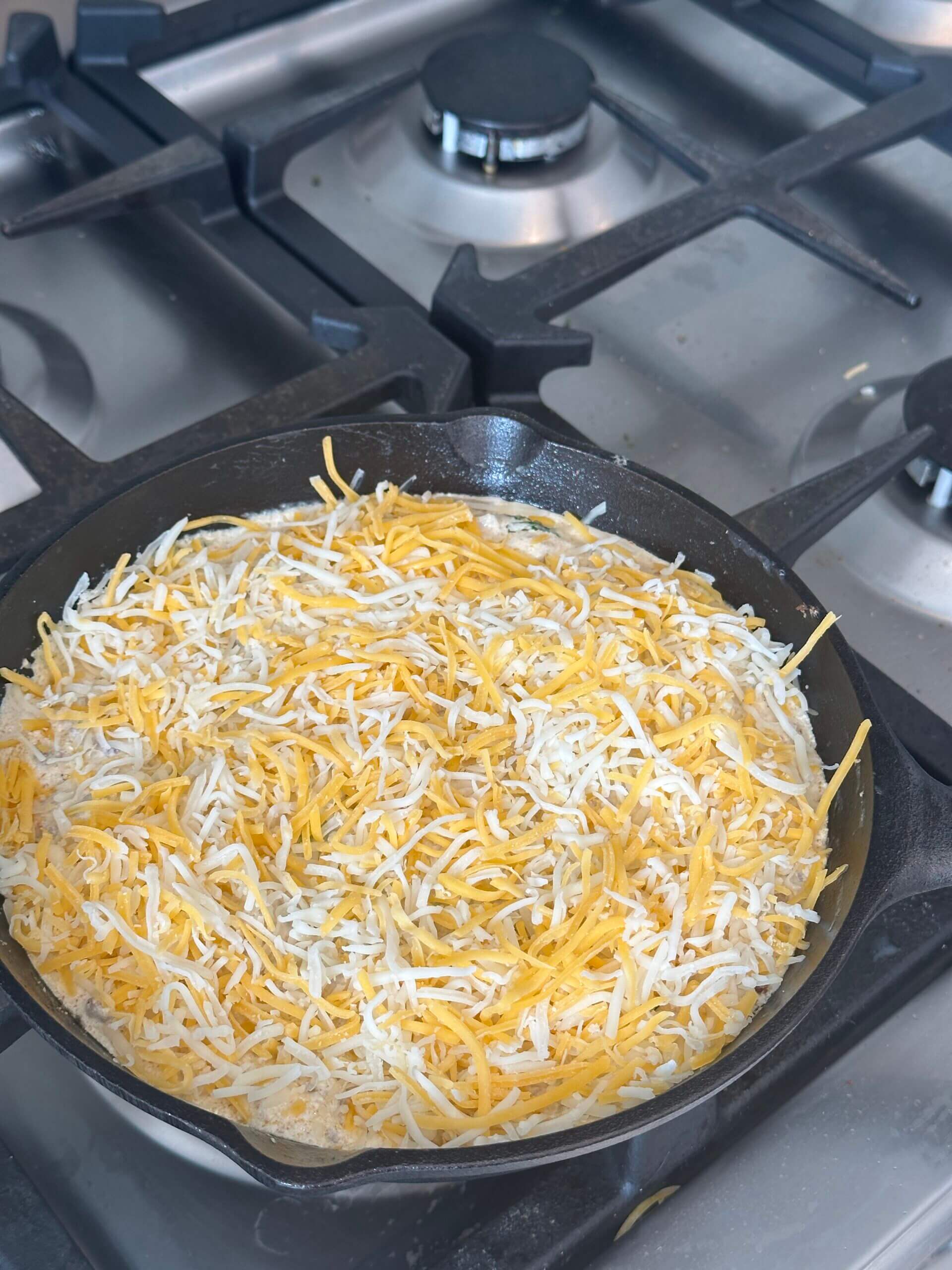 Add your blended cottage cheese mixture to your cast iron and cover your sautéed beef & veggies!