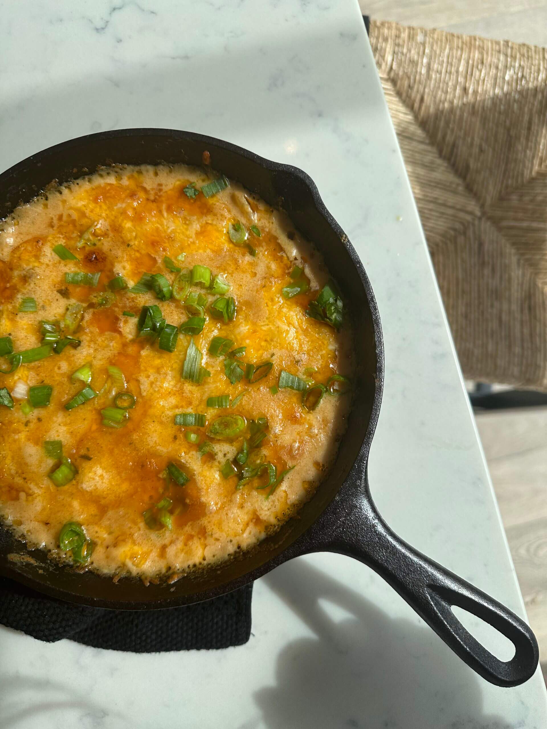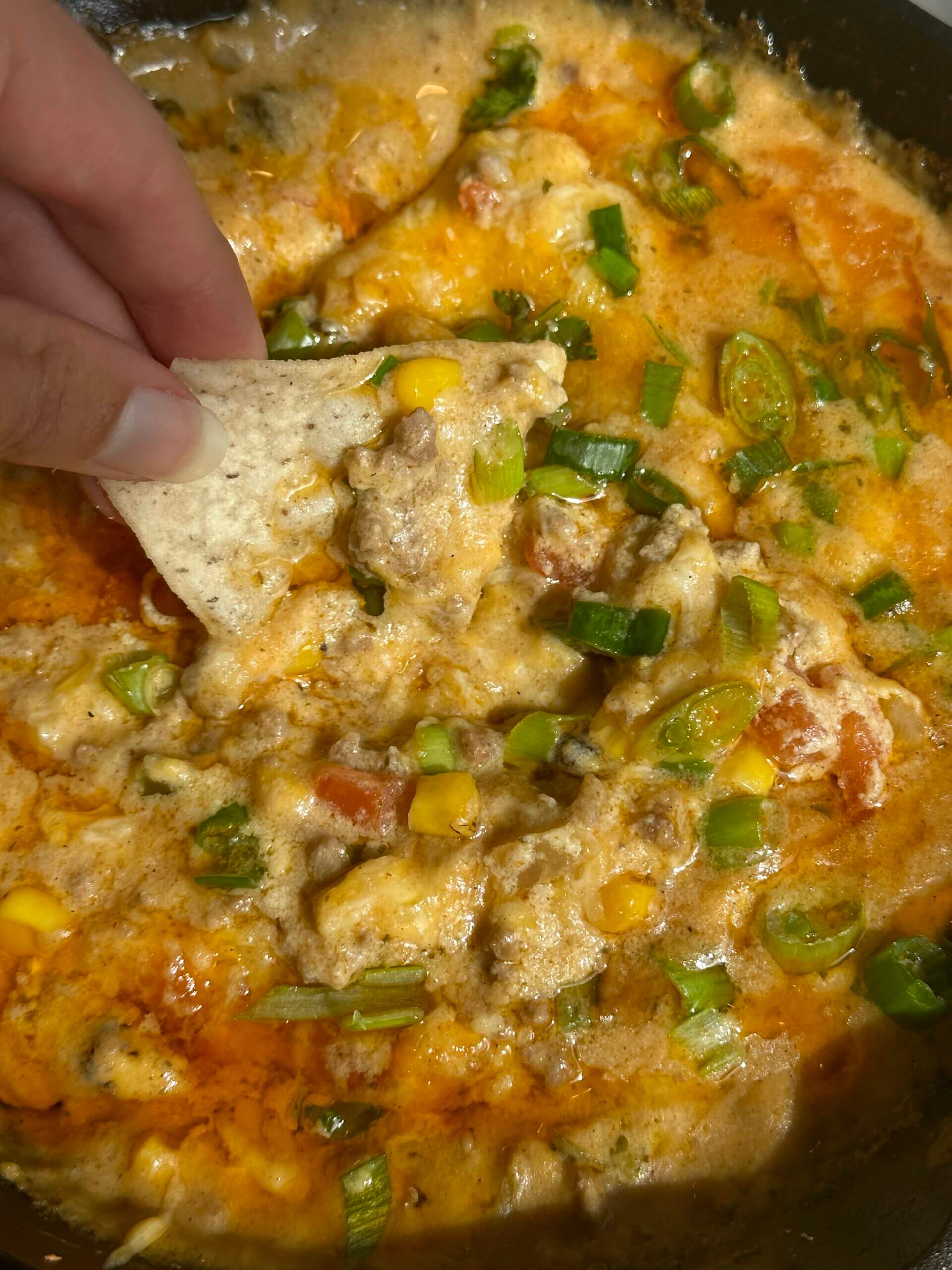 My goooshhh it’s good. I love football season because I loveeee good game day food, and since it’s BACK THIS WEEK🏈 (!!!!) I decided to come in hot with this Healthified Protein Packed Cast Iron Chile Con Queso with Roasted Corn. With the beef, cheese and cottage cheese, this dip has a great amount of protein. PS. If you have a bigger cast iron skillet than 8 in, just up the ingredients a little bit to fill your pan.