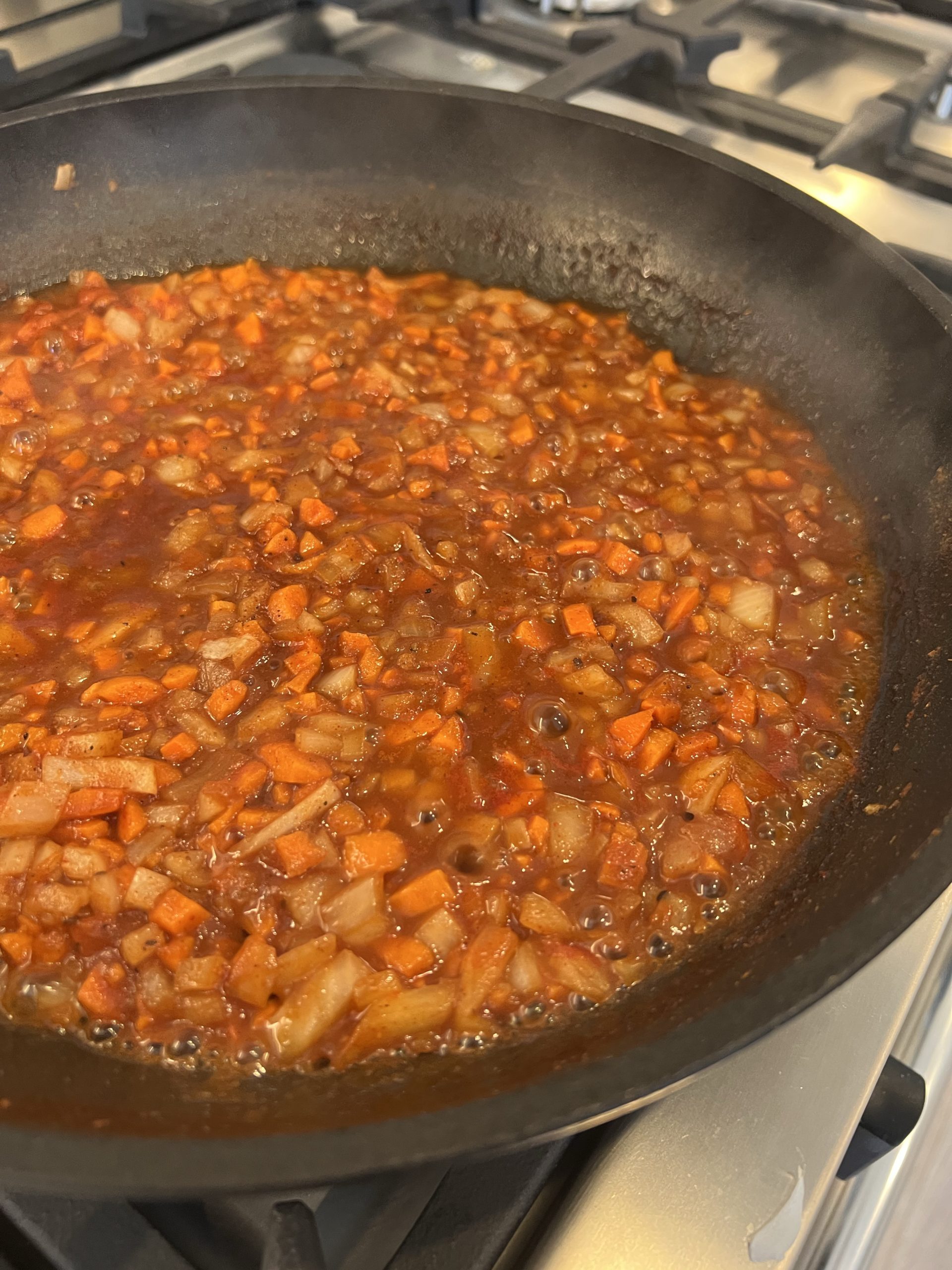 For the sauce: add all ingredients to a pan and simmer for about 5 minutes.Then add the diced carrots and onions to the sauce and simmer for about 8-10 minutes.