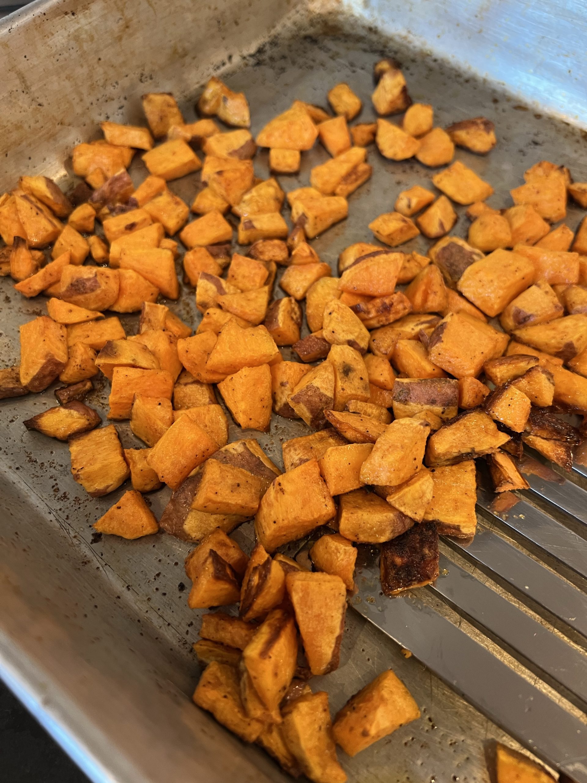 First, lightly peel (aka not fully taking off the skin off) and dice up the sweet potatoes and add to a baking sheet with some olive oil, lawry’s salt, garlic powder and chili powder. Bake at 425 degrees for 20-25 minutes.